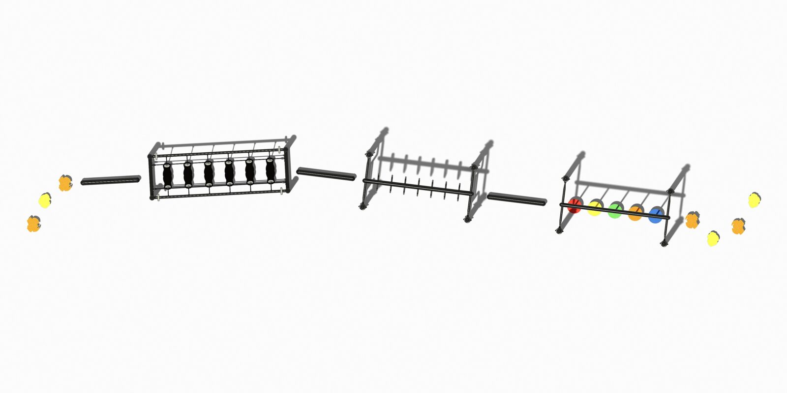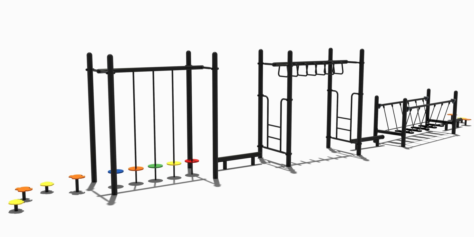 Hoe kom jij naar de andere kant? En dat zonder de grond te raken! Het parcours bestaat uit verschillende hang- en balanceertoestellen en begint en eindigt met een aantal stepjes (waar je overigens ook op kunt gaan zitten). Verder vindt je 3 balanceerbalken in het parcours, een balanceerbrug, een hangtoestel en een wiebelbrug waar stepjes aan touwen zijn gehangen. Een uitdagend parcours dus dat naar eigen inzicht nog aan te vullen is met andere sporttoestellen voor een nog uitgebreidere bootcamp-workout.