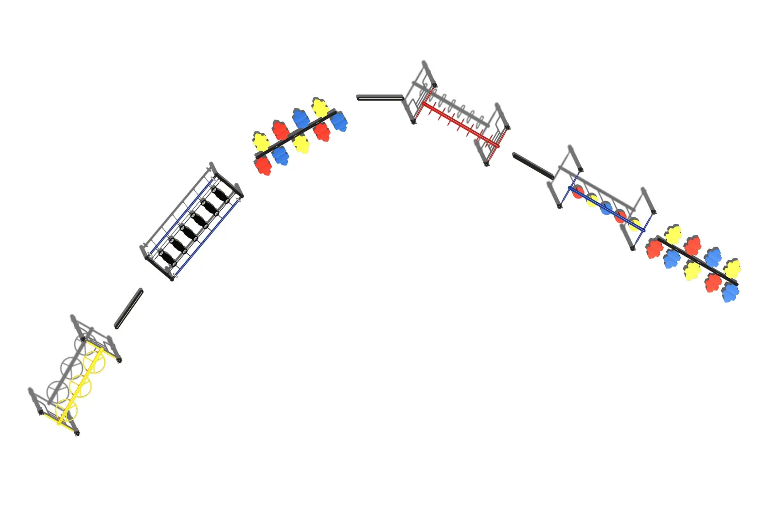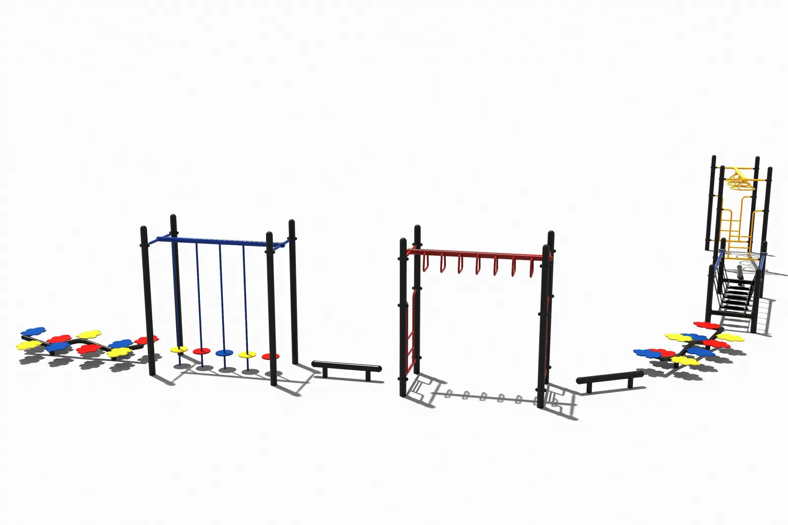 Hoe kom jij naar de andere kant? En dat zonder de grond te raken! Het parcours bestaat uit verschillende hang- en balanceertoestellen en begint en eindigt met een aantal stepjes (waar je overigens ook op kunt gaan zitten). Verder vindt je 3 balanceerbalken in het parcours, een balanceerbrug, een hangtoestel en een wiebelbrug waar stepjes aan touwen zijn gehangen. Een uitdagend parcours dus dat naar eigen inzicht nog aan te vullen is met andere sporttoestellen voor een nog uitgebreidere bootcamp-workout.
