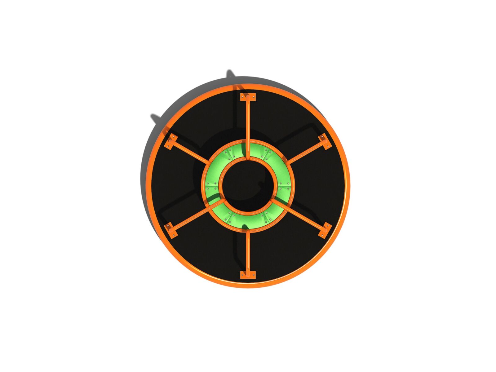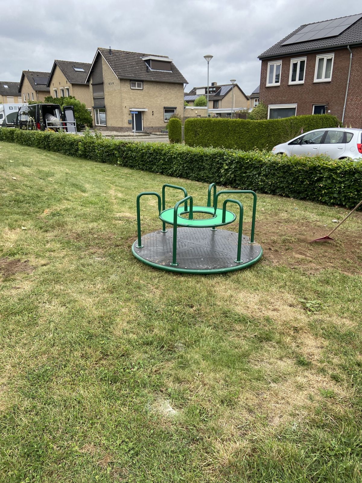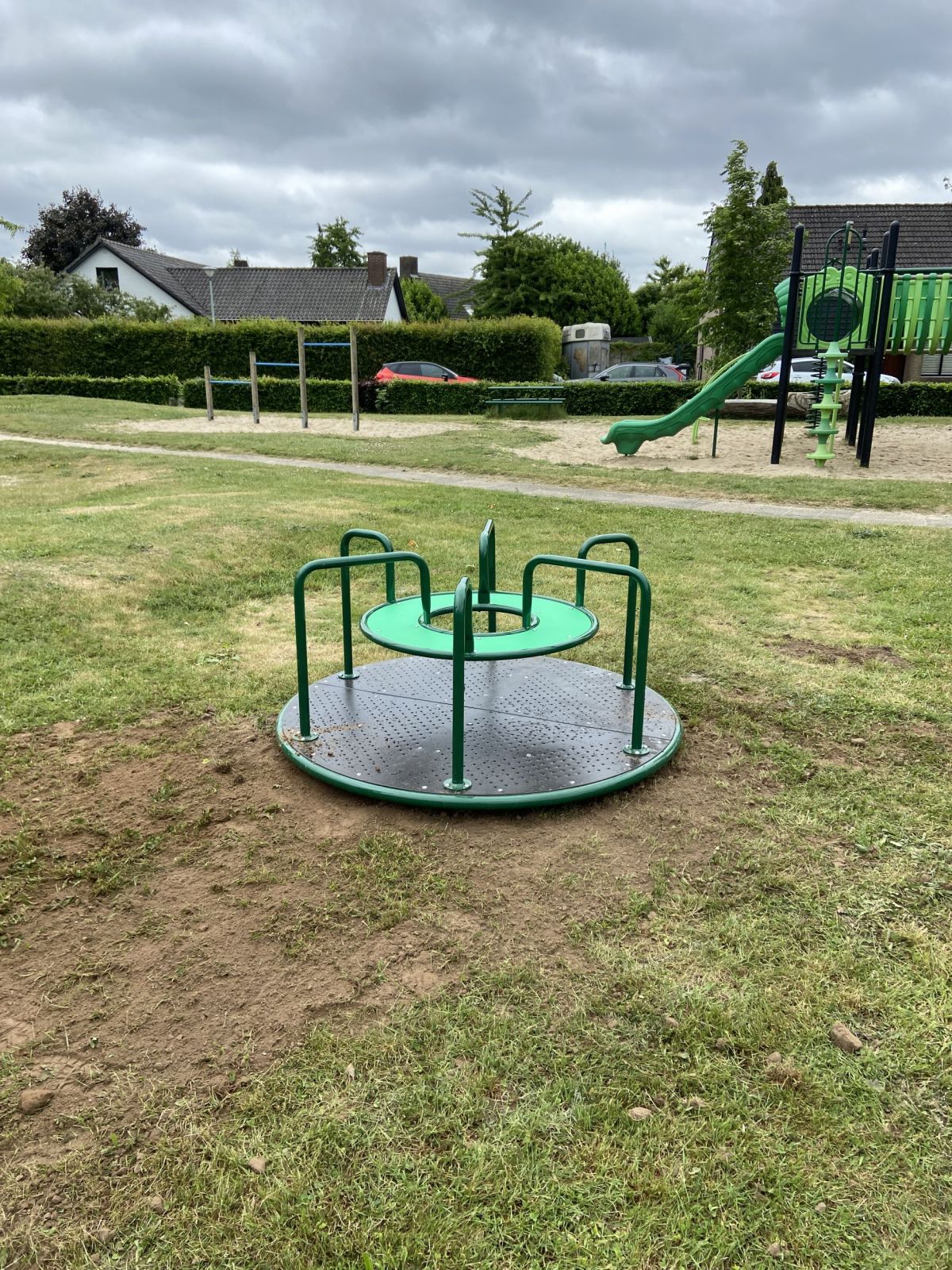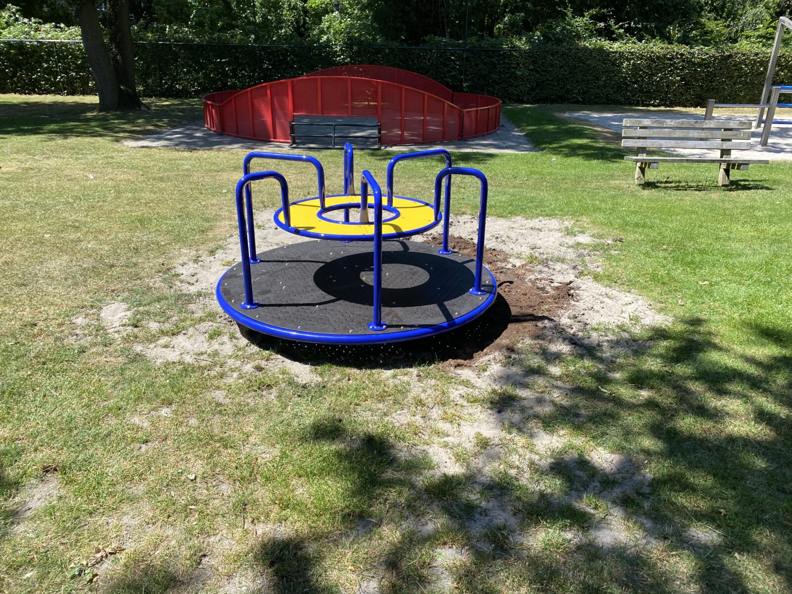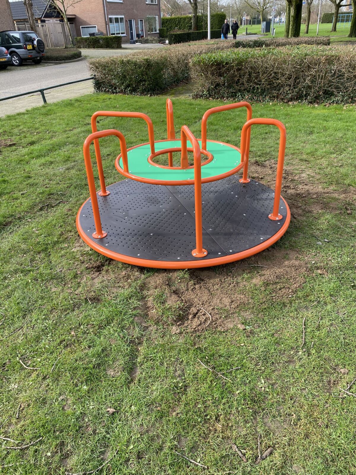 Geen enkele speelplek is compleet zonder draaitoestel. En dat geldt ook voor deze draaicaroussel waar je met lekker veel kinderen tegelijk op kunt draaien.