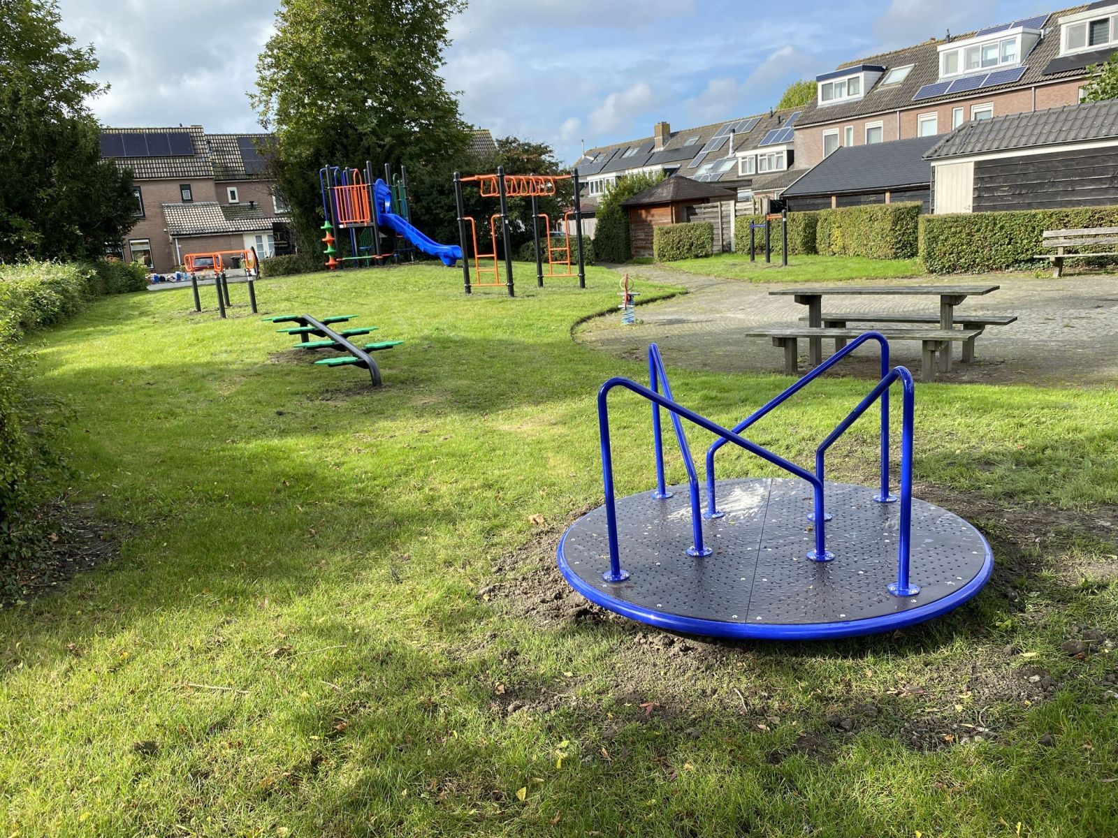 Op dit ruime draaitoestel kun je met meerdere kinderen draaien tot je er duizelig van wordt.