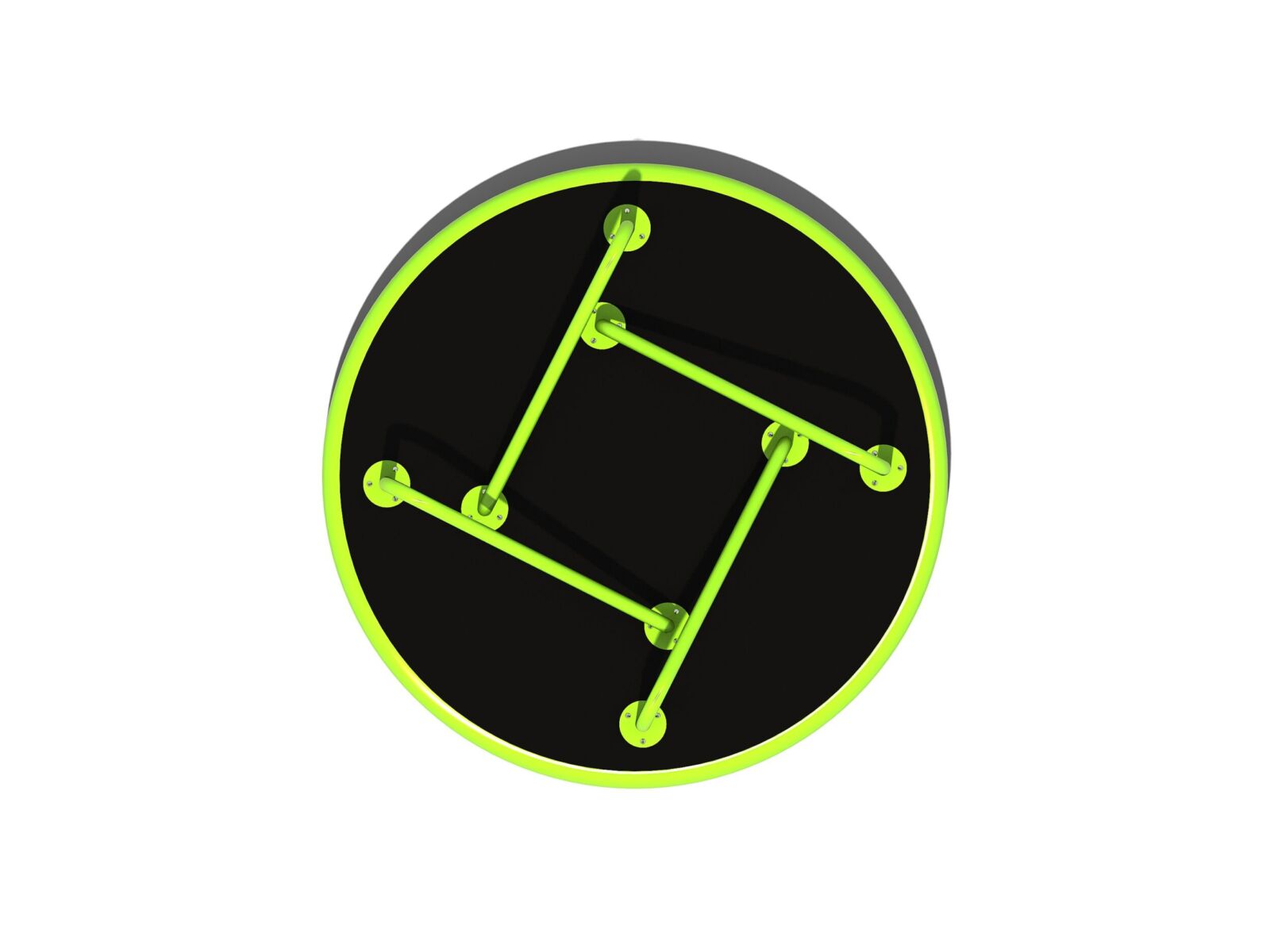 Deze draaischijf bestaat uit een ruim draaiplateau met een diameter van 170 cm. Hier passen dus minimaal vier kinderen op. De stangen waaraan je je kunt vasthouden of waar je tegen kunt leunen zijn niet paralel geplaatst zodat de kinderen op verschillende plekken kunnen gaan staan.