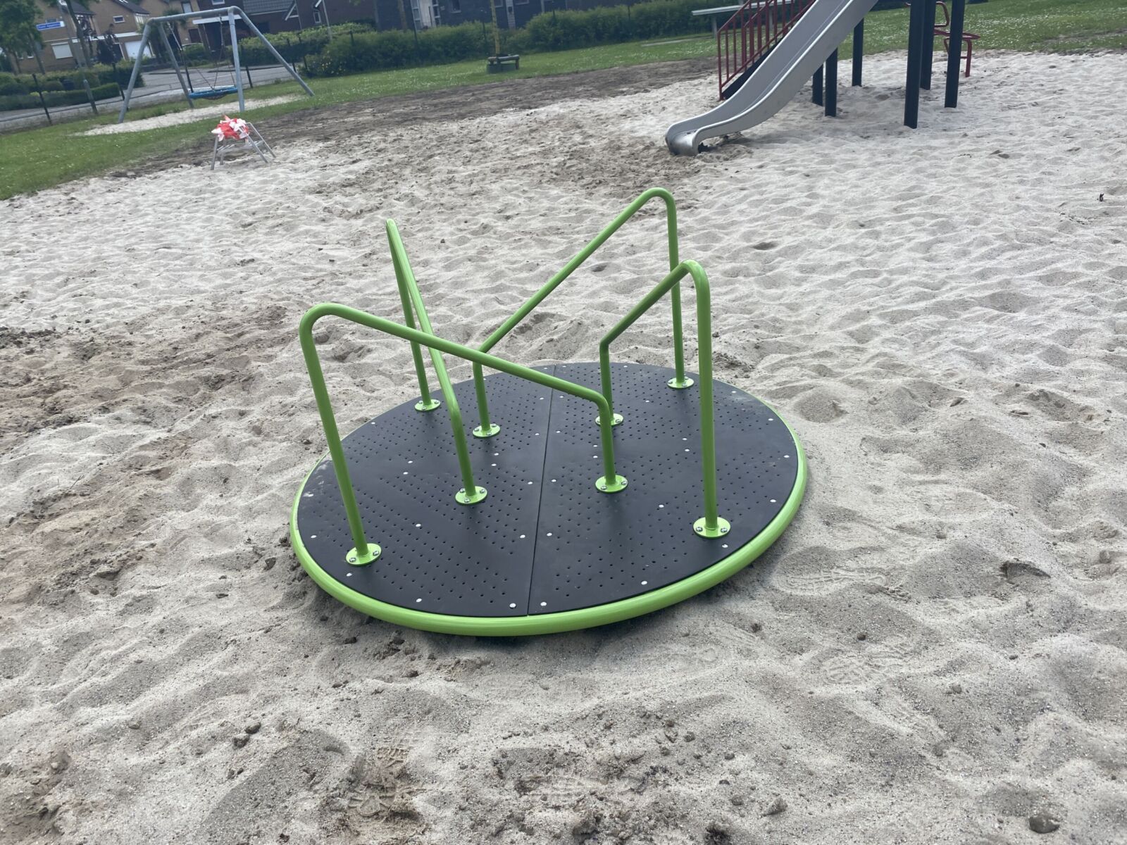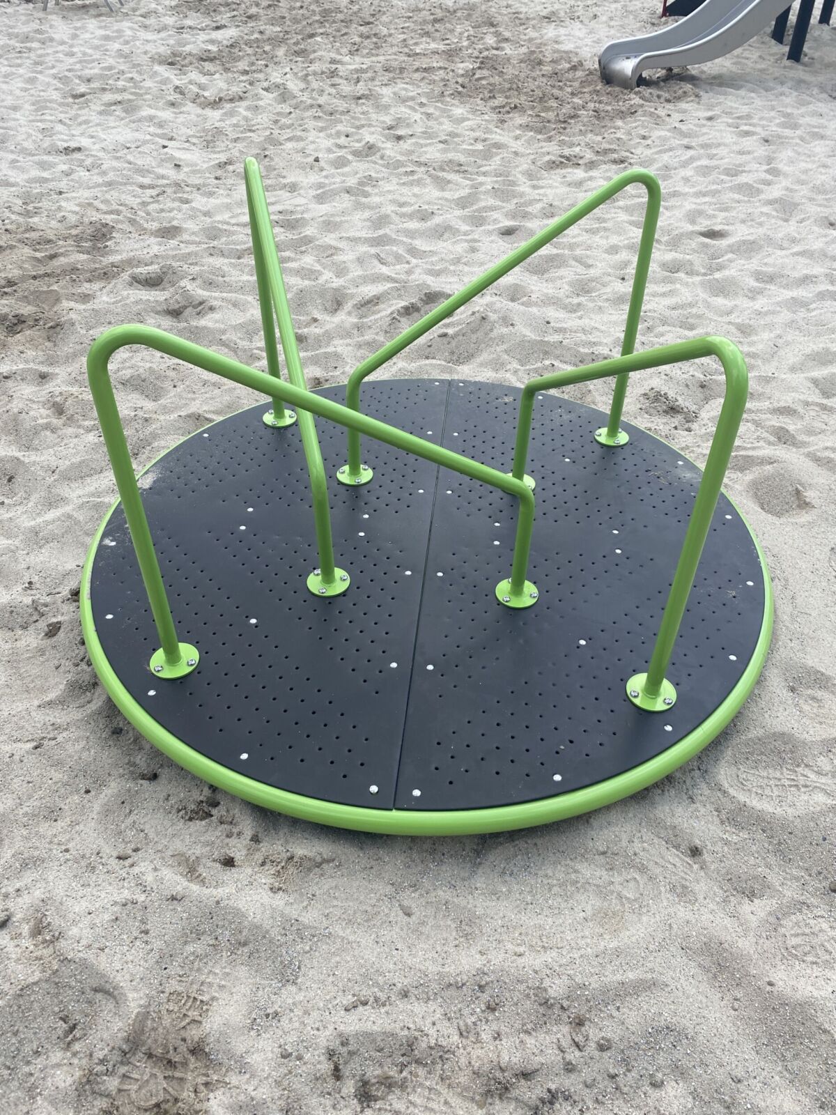 De uitdaging is natuurlijk om dit draaitoestel aan het draaien te krijgen en te houden. Dat kost wel wat inspanning (tenzij iemand voor je draait) en sta je er met meerdere kinderen op dan moet je wel met elkaar overleggen hoe je de draaischijf in beweging gaat zetten en houden.
