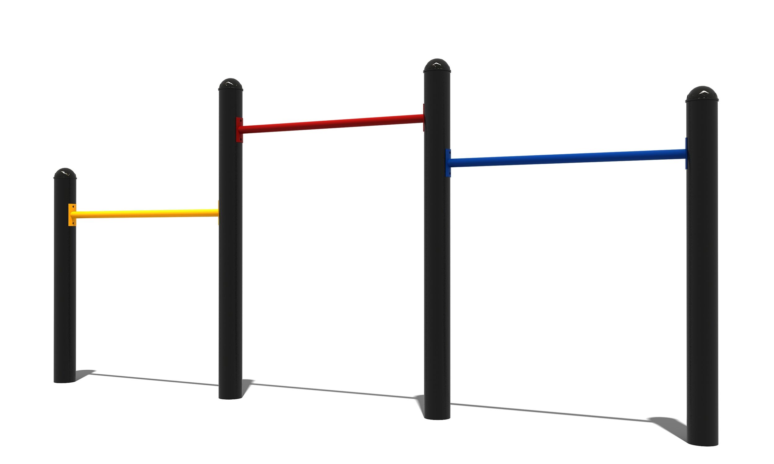 Het duikelrek met drie rekstokken van TnT Speeltoestellen is modern en strak vormgegeven. Het frame is gemaakt van gegalvaniseerd staal en met een chique zwarte poedercoating afgewerkt. De paalkappen en de duikelstangen zijn leverbaar in verschillende kleuren. Welke dat zijn mag je zelf weten. Kies je voor één kleur van alle stangen of neem je voor iedere rekstok een andere kleur? Zo stel je zelf je duikelrek op maat samen.
