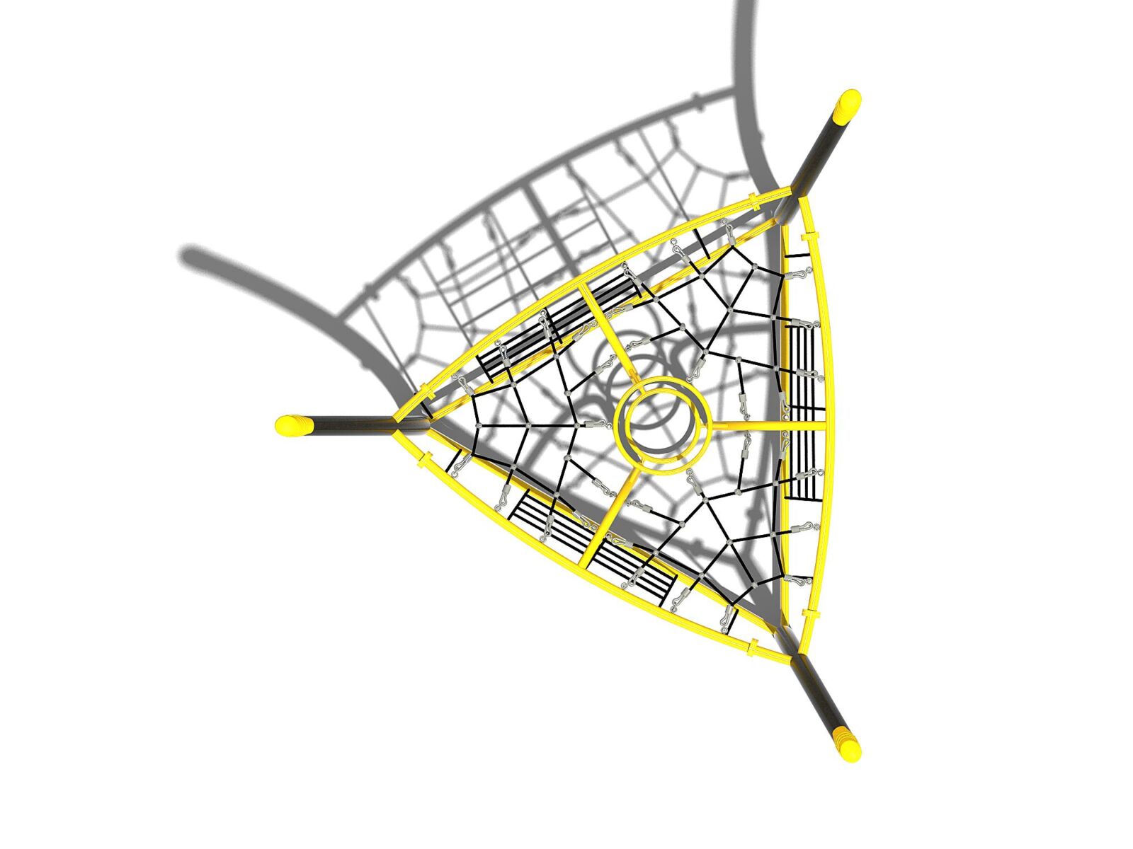 Dit klimtoestel is in een driehoek opgesteld. De fraai gebogen staanders zijn gemaakt van zwart gepoedercoat staal. Zowel onderaan als bovenaan houden een driehoek, eveneens gemaakt van gepoedercoat metaal, de staanders als het ware bij elkaar. In het midden is een klimgedeelte gemaakt dat is opgebouwd uit ringen. Hier kun je zowel via de binnen- als via de buitenkant naar boven klimmen. Op de staanders na, deze zijn altijd in zwart uitgevoerd, kun je voor de andere metalen onderdelen je eigen kleur kiezen, alsmede ook voor de paalkappen op de staanders. Voor nog meer klimplezier zijn tussen de staanders klimnetten gemaakt van stevig staaltouw.