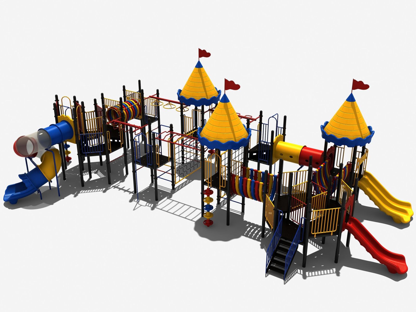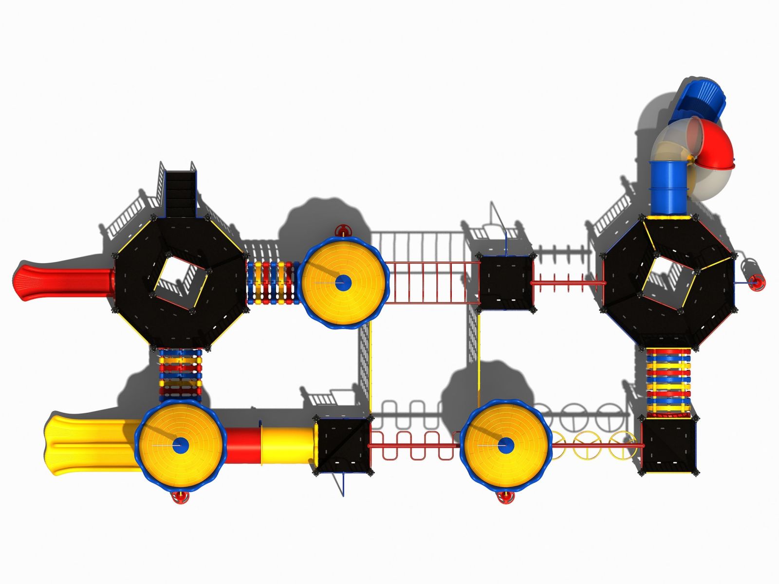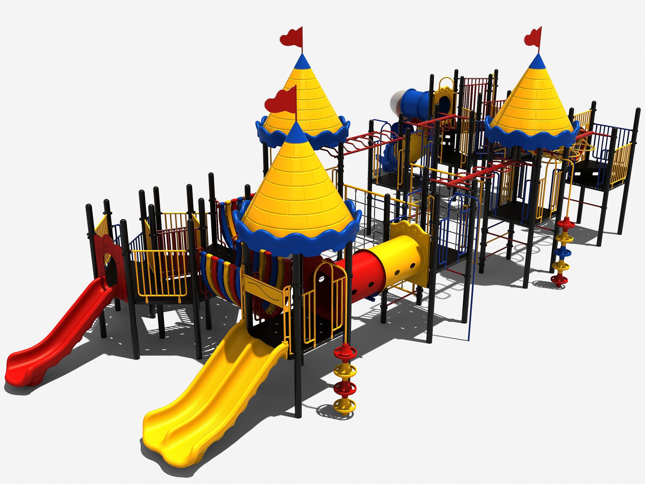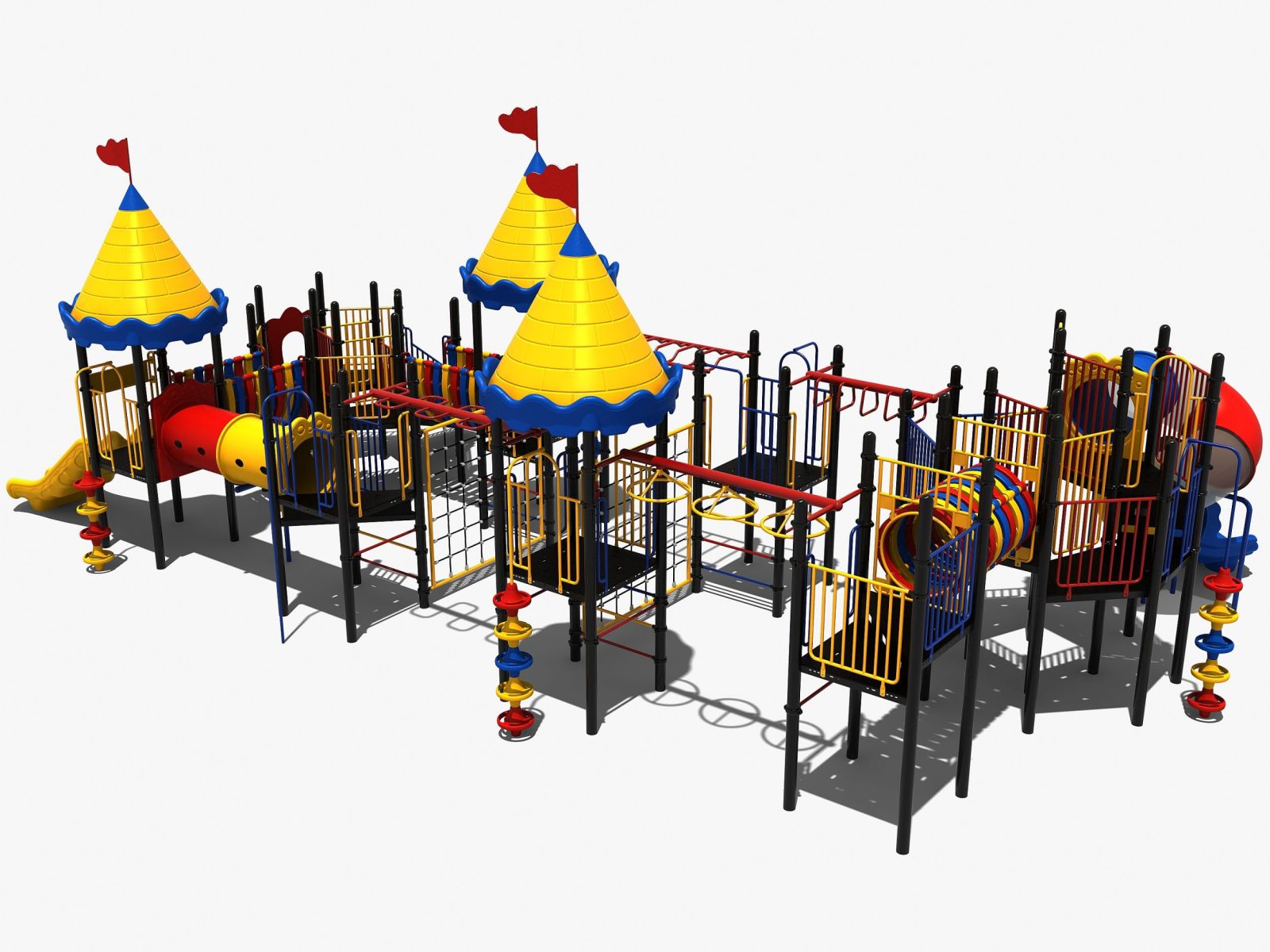 Wat heeft dit speelkasteel eigenlijk niet? Met 8 platformen, 3 met een circusdak en 2 met supergrote vloeren die allemaal met elkaar verbonden zijn door diverse speelelementen. Je kunt het hele speeltoestel rond zonder ook maar een keer de grond te hoeven raken. Toegegeven er zijn wel speelelementen bij die behoorlijk wat behendigheid en kracht vergen. Denk hierbij aan de verschillende hangelementen zoals de ringladder en de wielladder. En ook de opgang met de doppen en de steile klimnetten bieden een leuke uitdaging aan de oudere jeugd.