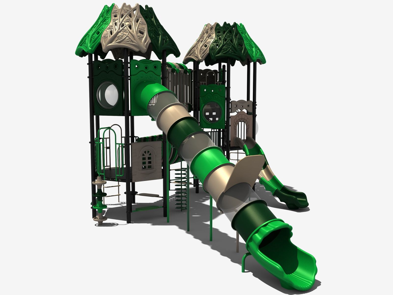 De speeltoren waaraan de grote rondlopende buisglijbaan is bevestigd, heeft twee vloeren die op verschillende hoogtes zijn geplaatst. De onderste zeshoekige vloer heeft drie opgangen naar boven. Je kunt via de u-vormige trap, de doppen- of de spiraalopgang. Onder dit platform vind je drie zitbankjes met een tafeltje. Wil je graag met de buisglijbaan naar beneden dan zul je eerst via de halfopen bottenbrug naar het andere platform moeten lopen om vandaar met een tussenstap naar de tweede verdieping te komen. Hier loop je via de verbindingsbrug weer terug om in de glijbaan te kunnen stappen.