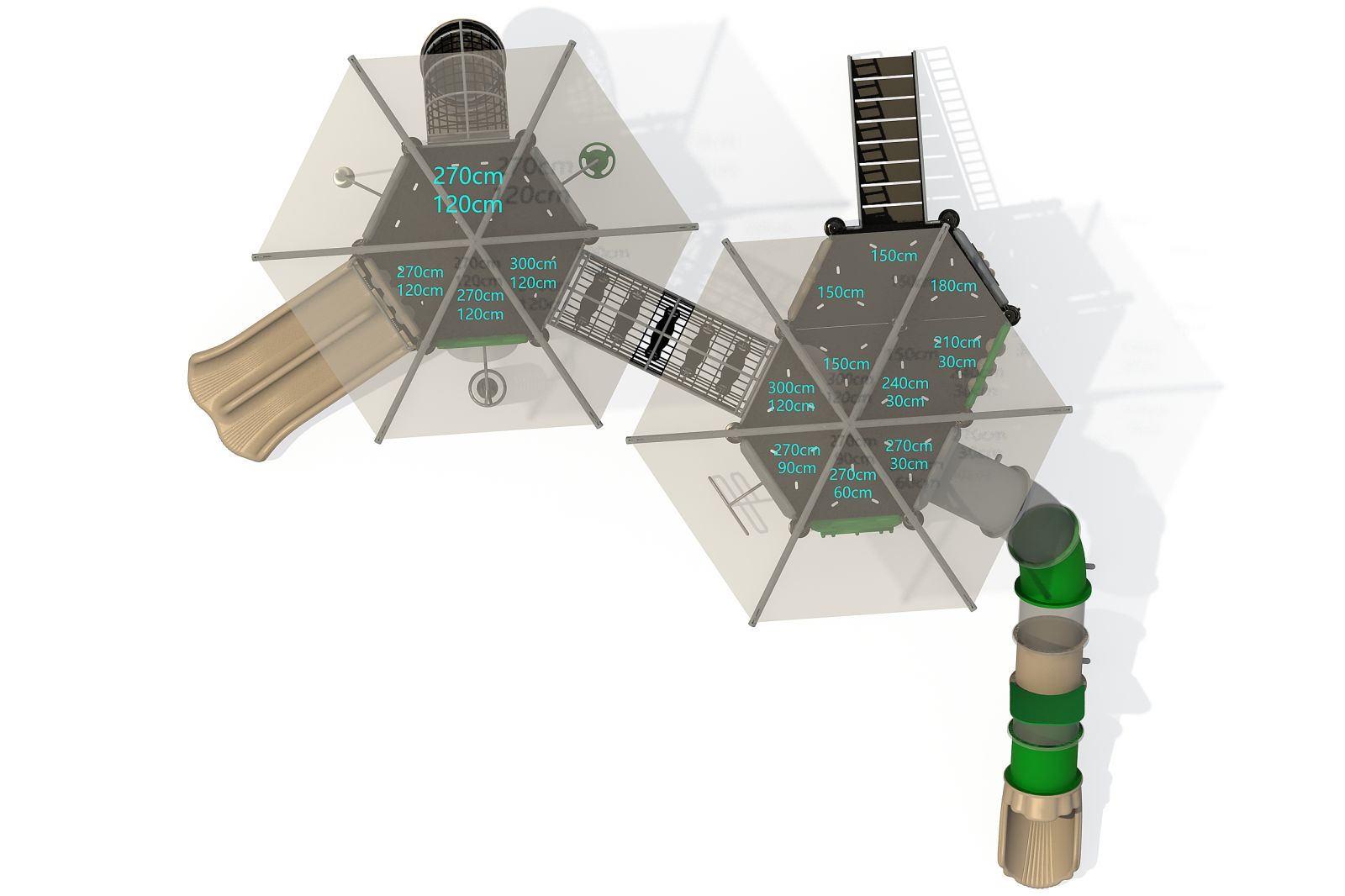 Zeker! De meeste van onze speeltoestellen zijn helemaal aan te passen naar jouw wensen. Je kunt platformen en speelelementen toevoegen of wijzigen. Je kunt ook zelf een speeltoestel samenstellen in onze TnT 3D-ontwerper.