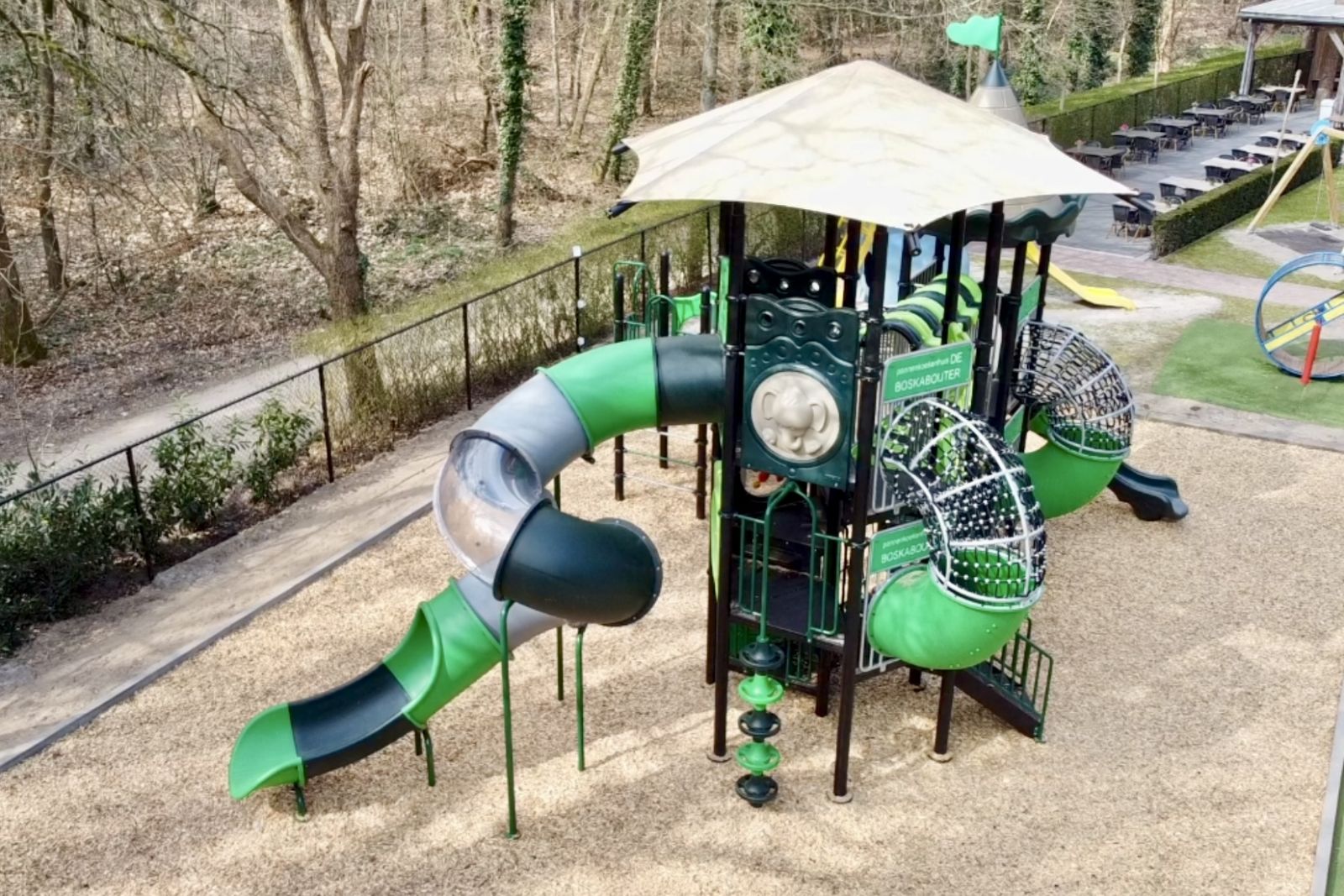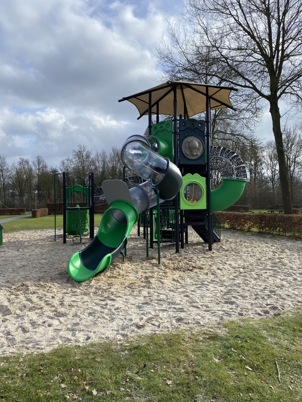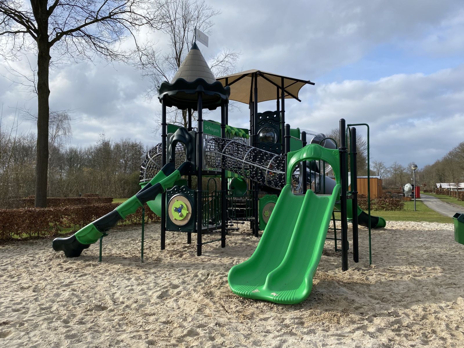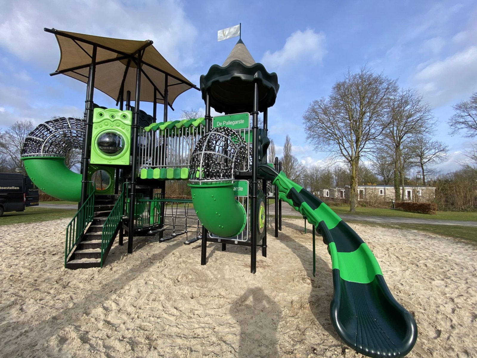 Grote speeltoren met verschillende hoogteniveaus en buisglijbaan