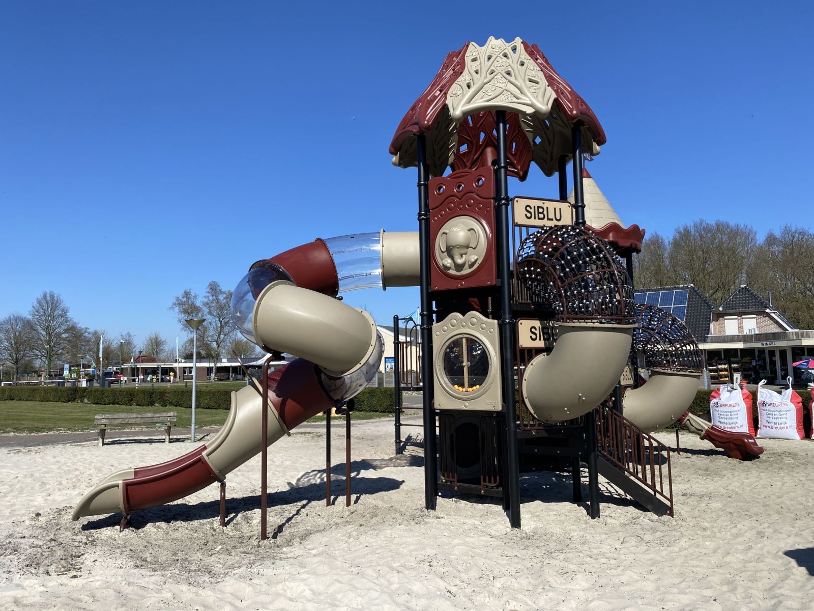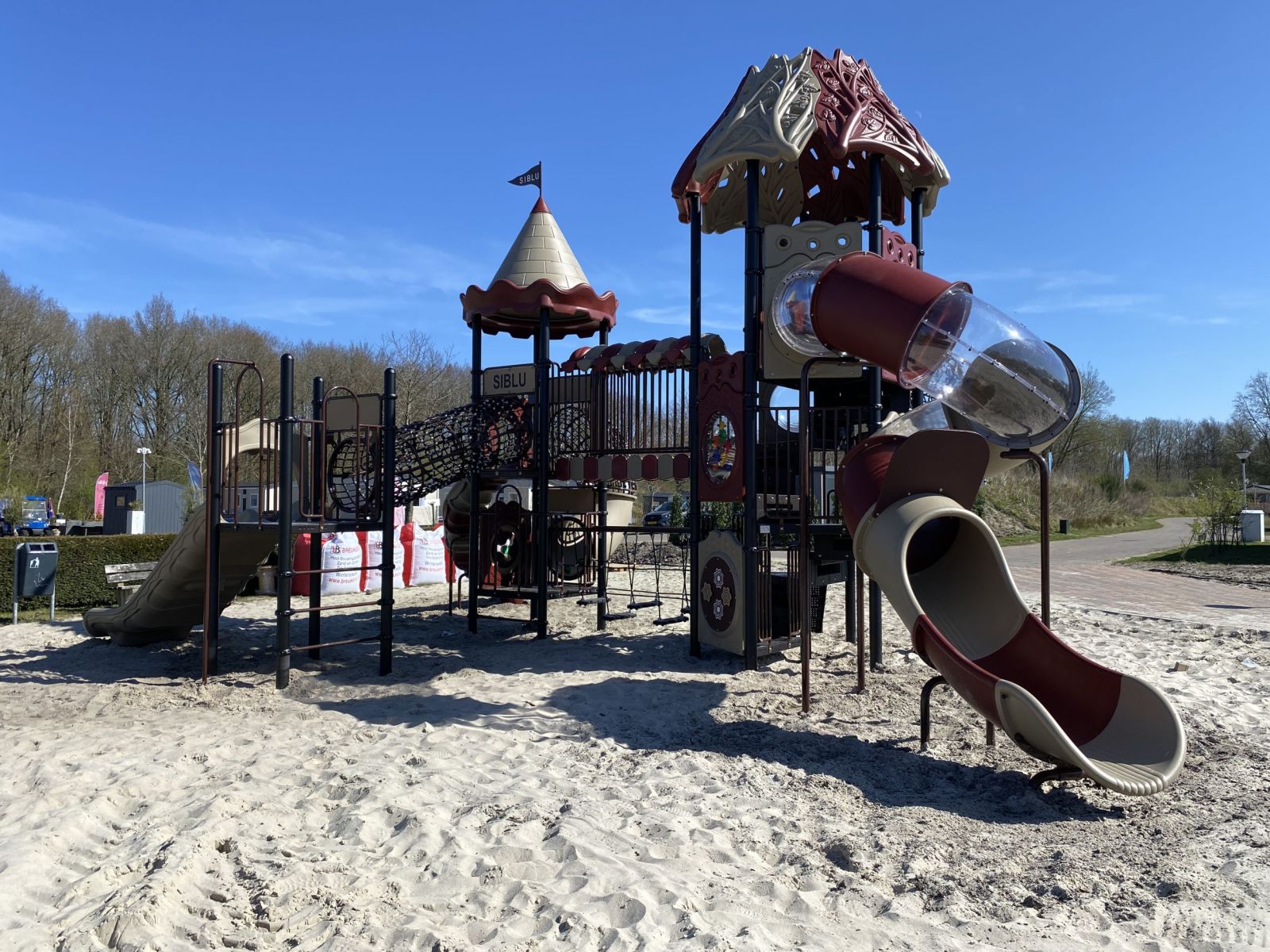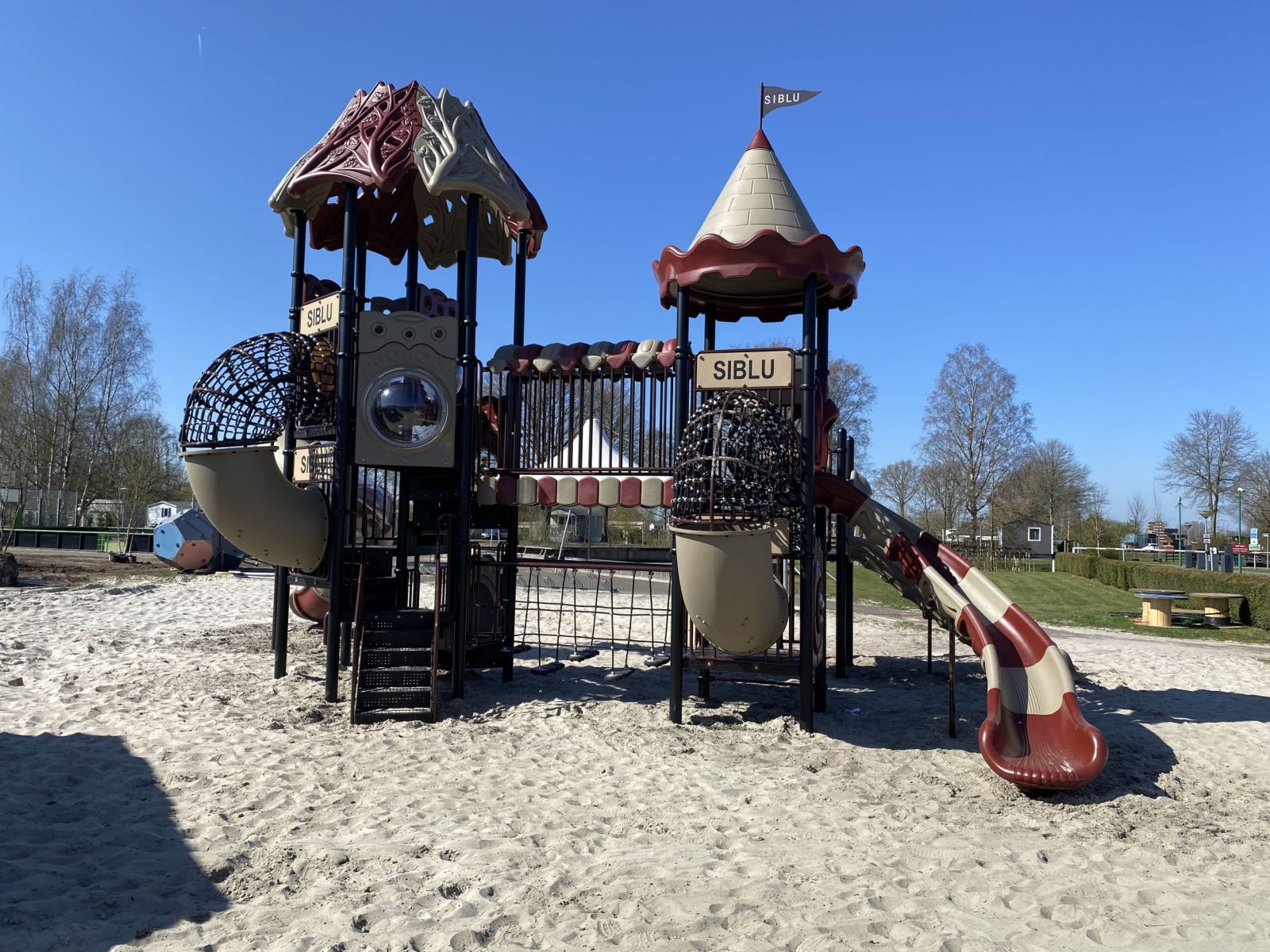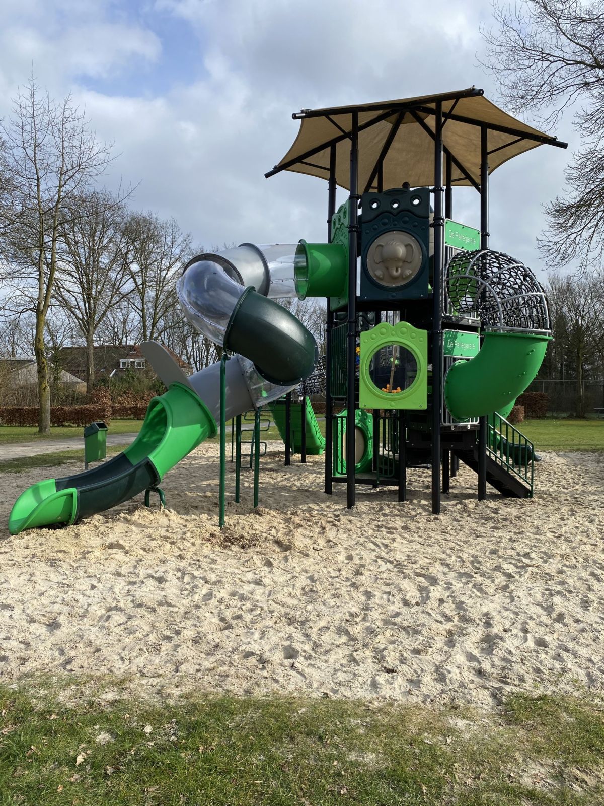 Grote speeltoren met verschillende hoogteniveaus en buisglijbaan