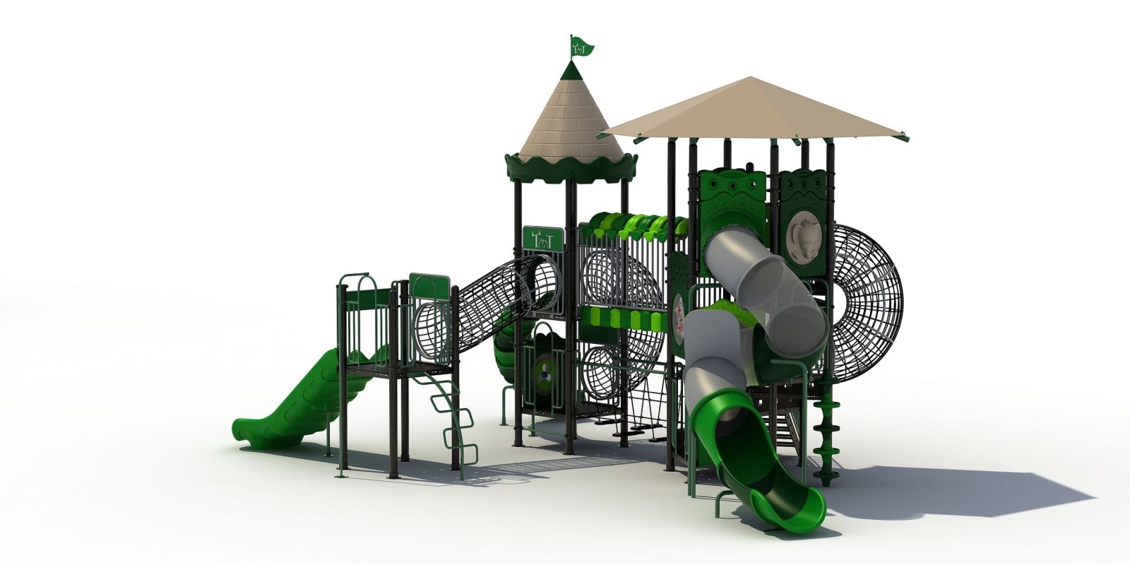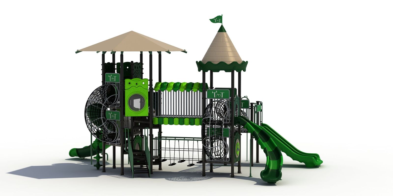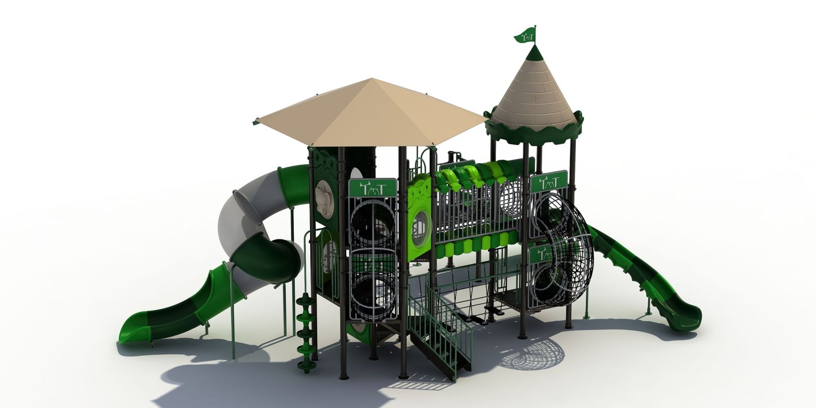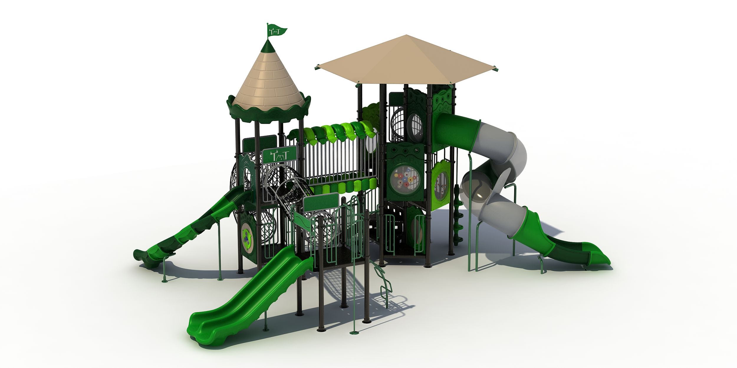 De grootste toren bestaat uit verschillende hoogteniveaus. Het zeskantige dak bovenop is gemaakt van schaduwdoek. Er is een veilige trap met leuning naar een laag platform, ideaal voor jonge kinderen. Hier zit ook de wiebelbrug om naar de overkant te balanceren. Ook kun je via de doppenopgang direct naar een niveau hoger of met de halfronde nettenbuis naar het hoogste niveau van deze speeltoren. Van hieruit roetsj je met de grote buisglijbaan naar beneden of loop je via de loopbrug naar het platform met het kunststof puntdak. Ook kun je nog naar een tussenstation via de opgang met de kunststof doppen.