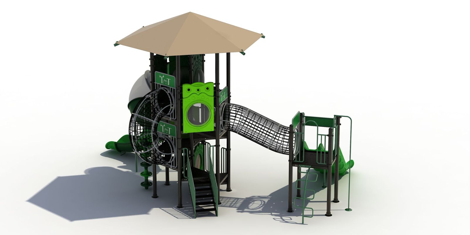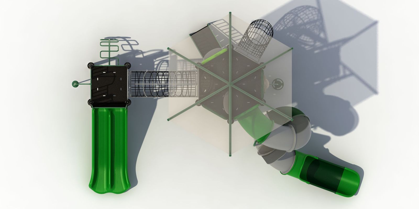 Voor een moderne uitstraling zijn bestaande materialen op een andere manier gebruikt voor dit speeltoestel. Voor het grote zeskantige dak bovenop de speeltoren is voor schaduwdoek gekozen. Het frame van de halfronde dichte klimbuis is gemaakt van gecoat en gegalvaniseerd metaal. Door de netten/touwen te versterken met staalkern, is de constructie sterk, duurzaam en veilig. Door het open karakter en de vormgeving ziet deze klimbuis er futuristisch uit.