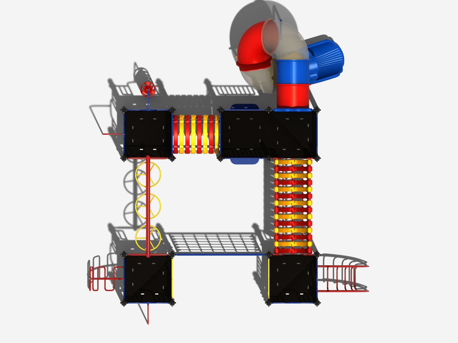 Het speeltoestel is opgebouwd uit vier platformen, twee vierkante en twee zandlopervormige plateaus (opgebouwd uit twee driehoekige vloeren). Aan alle platformen zijn opgangen gemaakt om naar boven en beneden te gaan. Je vindt onder andere een opgang met pionnen, een gebogen ladder, een gebogen slangentrap en verschillende klimrekken met horizontale spijlen. Aan twee platformen is een glijstang bevestigd en aan een derde platform vind je een grote tunnelglijbaan. Alle platformen zijn weer met elkaar verbonden door verschillende speelelementen zoals de dichte kruiptunnel, een halfopen balanceerbrug, een verticaal klimnet en de wielladder. Je kunt dus een compleet rondje maken zonder dat de voeten de vloer hoeven te raken.