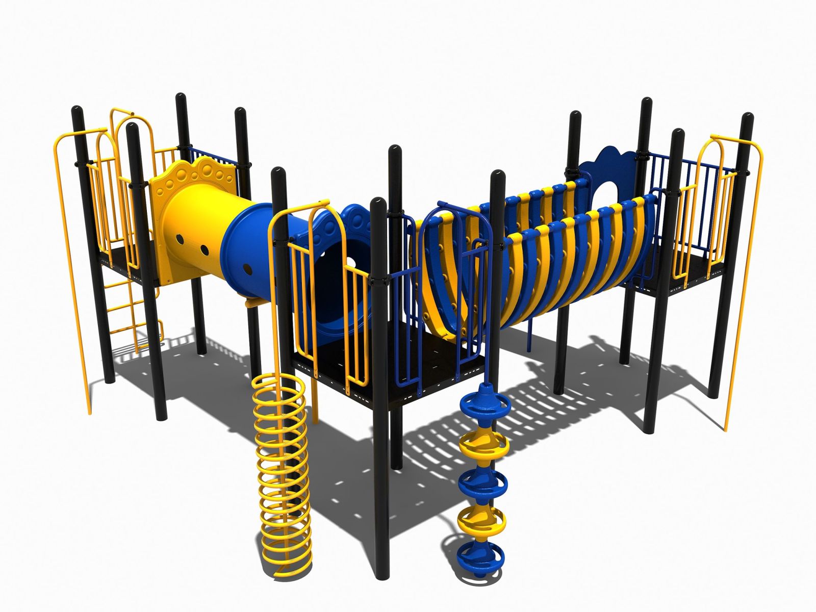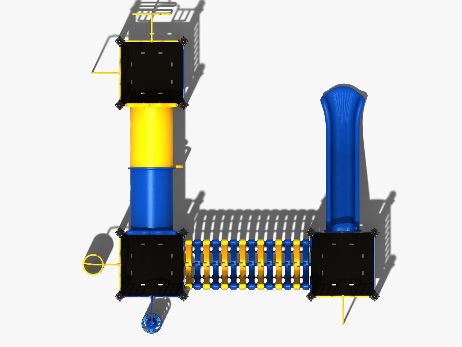 Dit klimtoestel heeft drie platformen die in een hoekmodel zijn opgesteld. De drie vloeren zijn met elkaar verbonden door een kruiptunnel en een halfdichte balanceertunnel. Bij twee platformen zijn opgangen geplaatst om naar boven te klimmen. Aan het ene platform is een slangenladder, als je voor deze kiest moet je via de kruiptunnel naar de andere vloer. Het tweede platform beklim je via de opgang met de doppen of de spiraalwikkel. Aan het derde platform zit een ruime kunststof glijbaan maar je kunt ook voor de glijstang kiezen om naar beneden af te zakken.