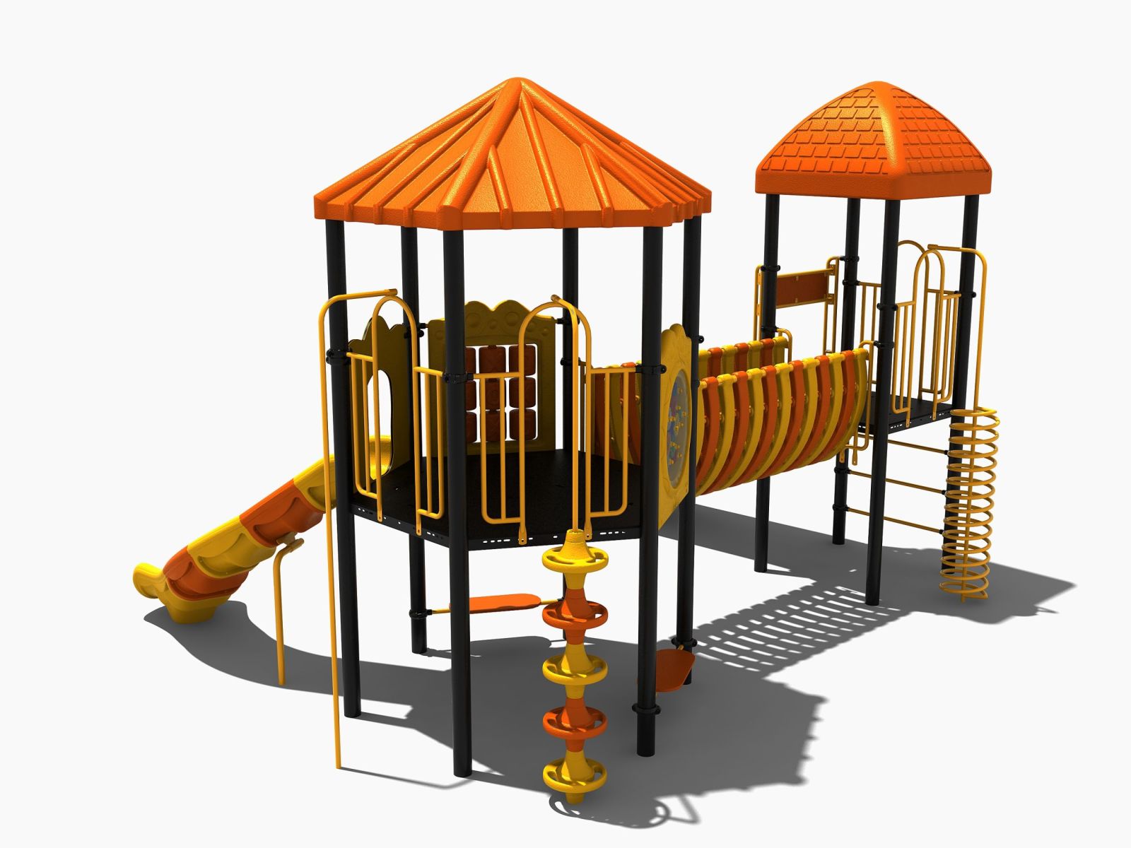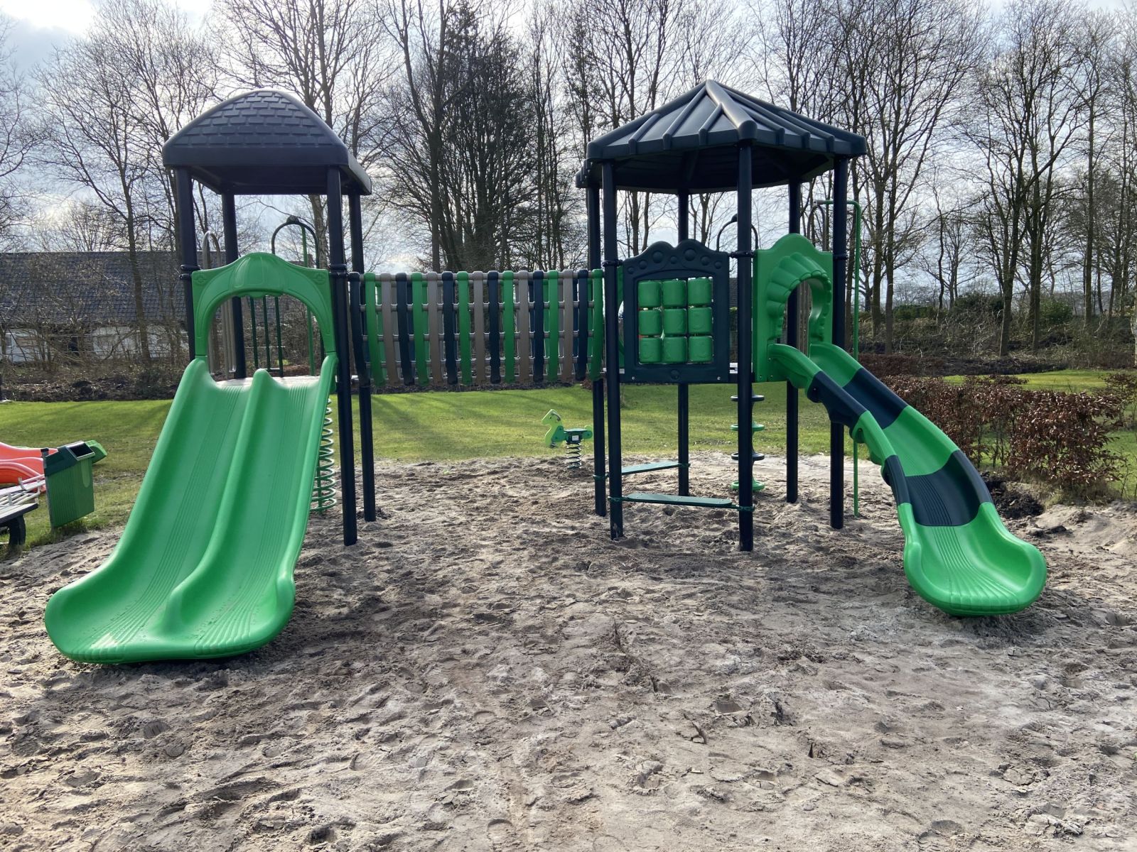 Maar dit combinatietoestel biedt veel meer dan alleen maar glijden. Het speeltoestel bestaat uit twee platformen die met elkaar verbonden zijn door een opvallende half open kunststof verbindingstunnel om doorheen te lopen of de kruipen. Het vierkant platform met de dubbele glijbaan beklim je door de spiraalopgang of het verticale klimrek en met de dubbele glijbaan sta je binnen no-time weer met beide voeten op de grond. Het zeshoekige platform kun je via de opgang met de kunststof doppen bereiken. Het leuke van dit platform is dat er in plaats van spijlhekken, educatieve spelpanelen zijn geplaatst. Hier kun je boven dus een spelletje drie op een rij spelen of de radertjes eens flink laten draaien. Wil je weer naar beneden dan glij je met een bochtje naar beneden. Onderaan dit platform is ook nog een mogelijkheid gemaakt om te gaan zitten. Plaats je dit speeltoestel in het zand dan heb je een lekker bankje om nog even in de zandbak te spelen. De kunststof dakjes boven de platformen beschermen je tegen de felle zon of een regenbuitje en maken dit speeltoestel helemaal af.