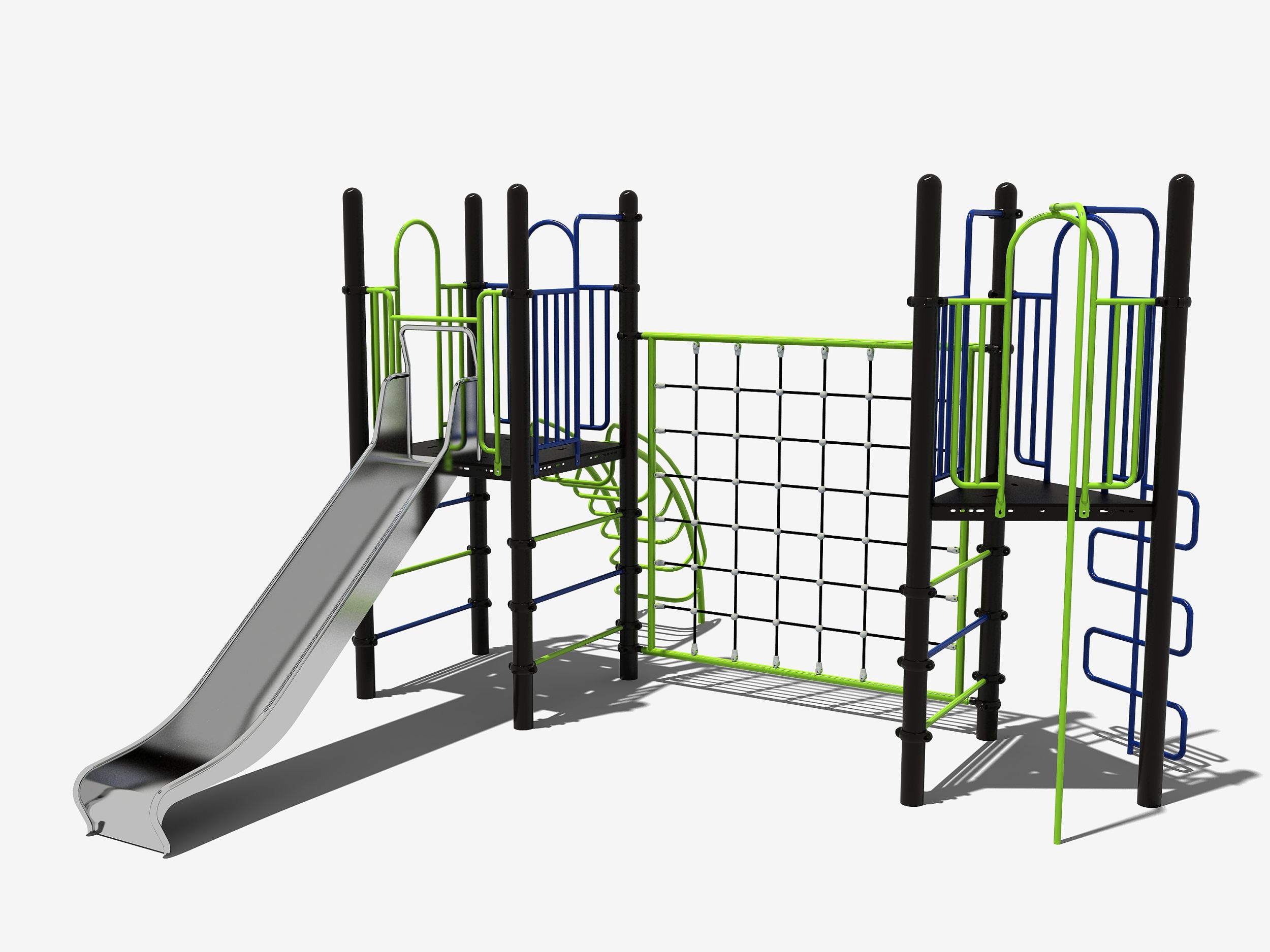 Het speeltoestel is opgebouwd uit twee platformen die met elkaar verbonden zijn door een klimnet. Aan het driehoekige platform zijn twee mogelijkheden geplaatst om naar boven te klimmen. Dit kan via de slangentrap of de horizontale spijlen aan het platform. Hier vind je ook een glijstang om als een brandweerman naar beneden te roetsjen. Het vierkante platform heeft aan beide kanten horizontale spijlen maar ook een gebogen klimrek. Aan dit ruime platform is een rvs glijbaan bevestigd. Het klimrek is voor de kinderen die wel een kleine uitdaging aan durven te gaan om van het ene naar het ander platform te komen zonder met de voeten de grond te raken. Het klimnet is gemaakt van stevig 6-draads staaltouw en kan tegen een stootje.