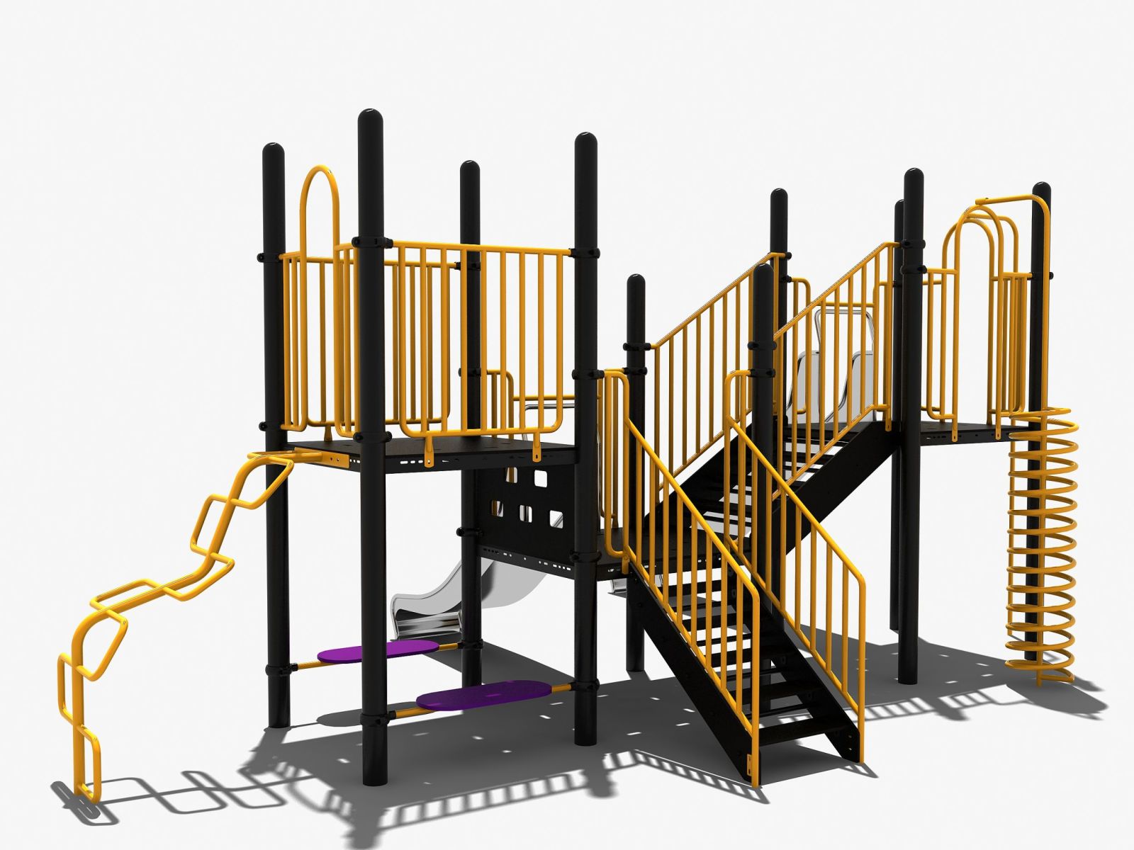 Al met al telt dit metalen speeltoestel maar liefst 5 vloeren die allemaal aan elkaar gekoppeld zijn tot een groot platform. Althans zo lijkt het, maar de vloeren bevinden zich op verschillende hoogteniveaus. Dit maakt dit combinatietoestel geschikt voor een grotere leeftijdsgroep. Het laagste platform bereik je via de stevige metalen trap met leuning. Op deze vloer is een korte rvs glijbaan bevestigd. Vanaf dit platform kun je twee kanten op. De ene kant bereik je met een flinke stap omhoog en hiermee kom je op de vloer met de gebogen slangentrap. Onder dit platform zijn twee bankjes gemaakt. De andere kant van het lage platform heeft een schuine vloer die naar het platform met de grote rvs glijbaan gaat. Hier kun je overigen ook met de glijstang naar beneden roetsjen. Aan dit platform is een klimelement in de vorm van een spiraalwikkel bevestigd.