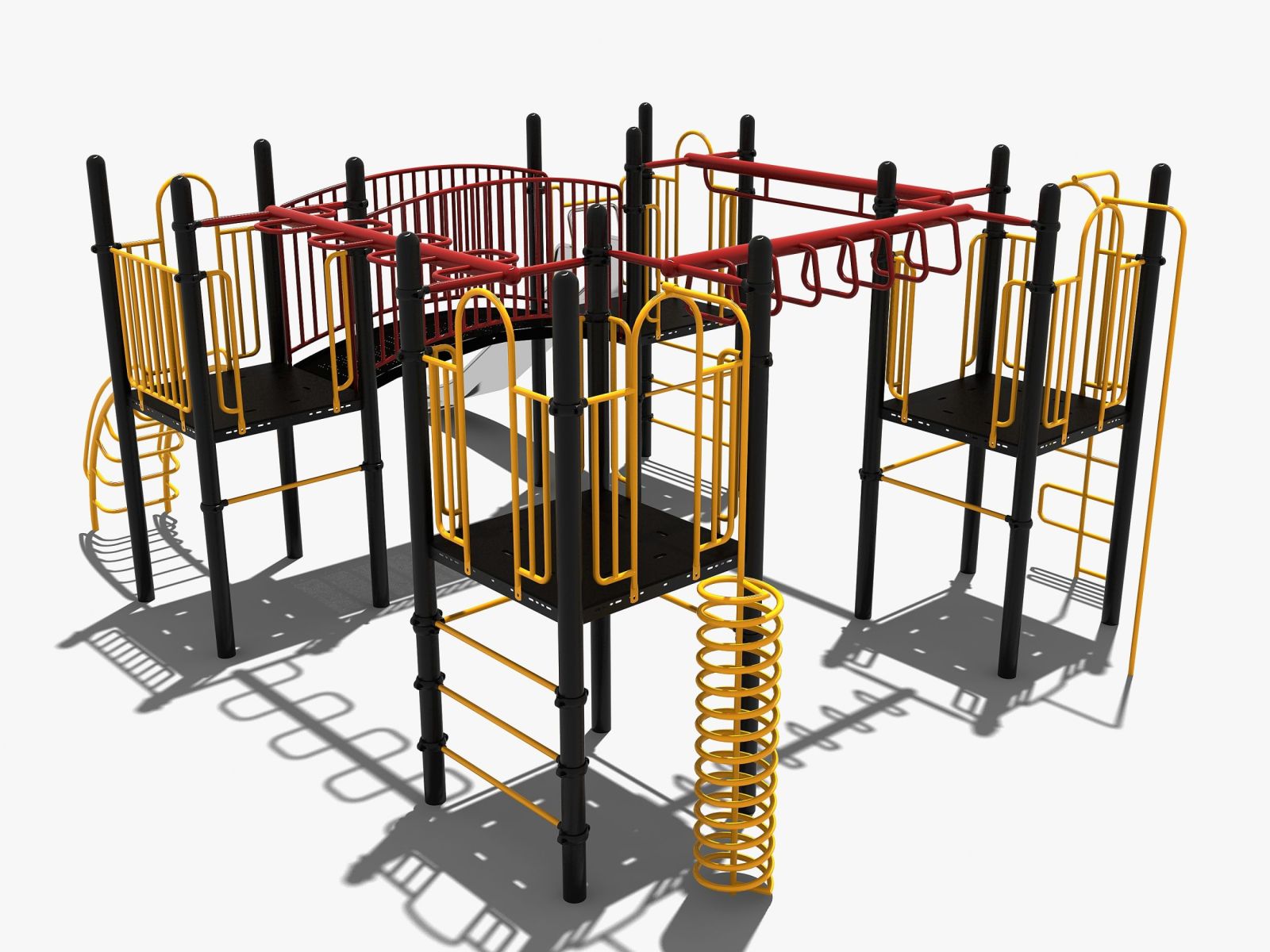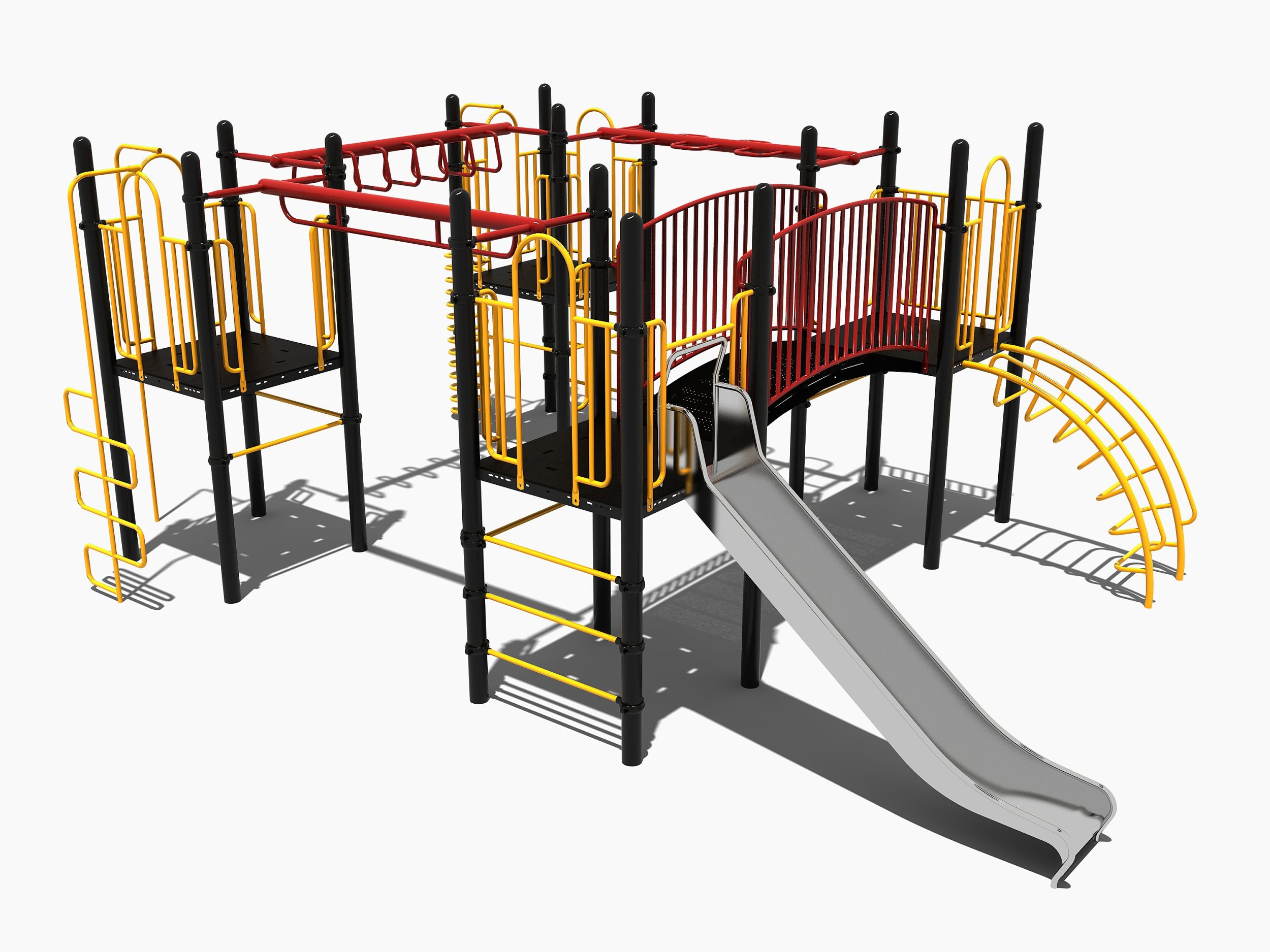 Uitgebreid combinatietoestel met met rvs glijbaan en rondgang. Dit speeltoestel met maar liefst vier platformen behoort tot de robuust metaal en rvs lijn. Dit betekent dat de glijbaan altijd van rvs is gemaakt en de rest van de onderdelen van sterk metaal.