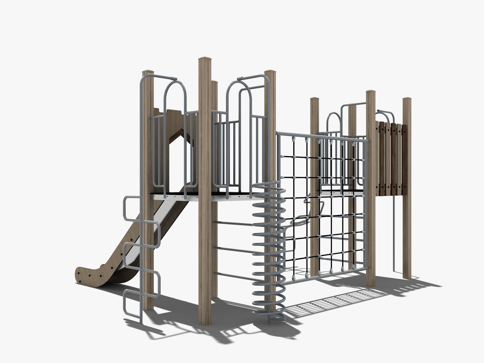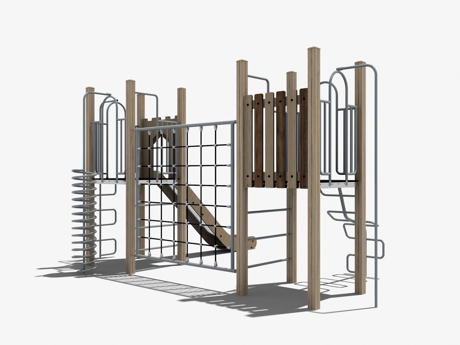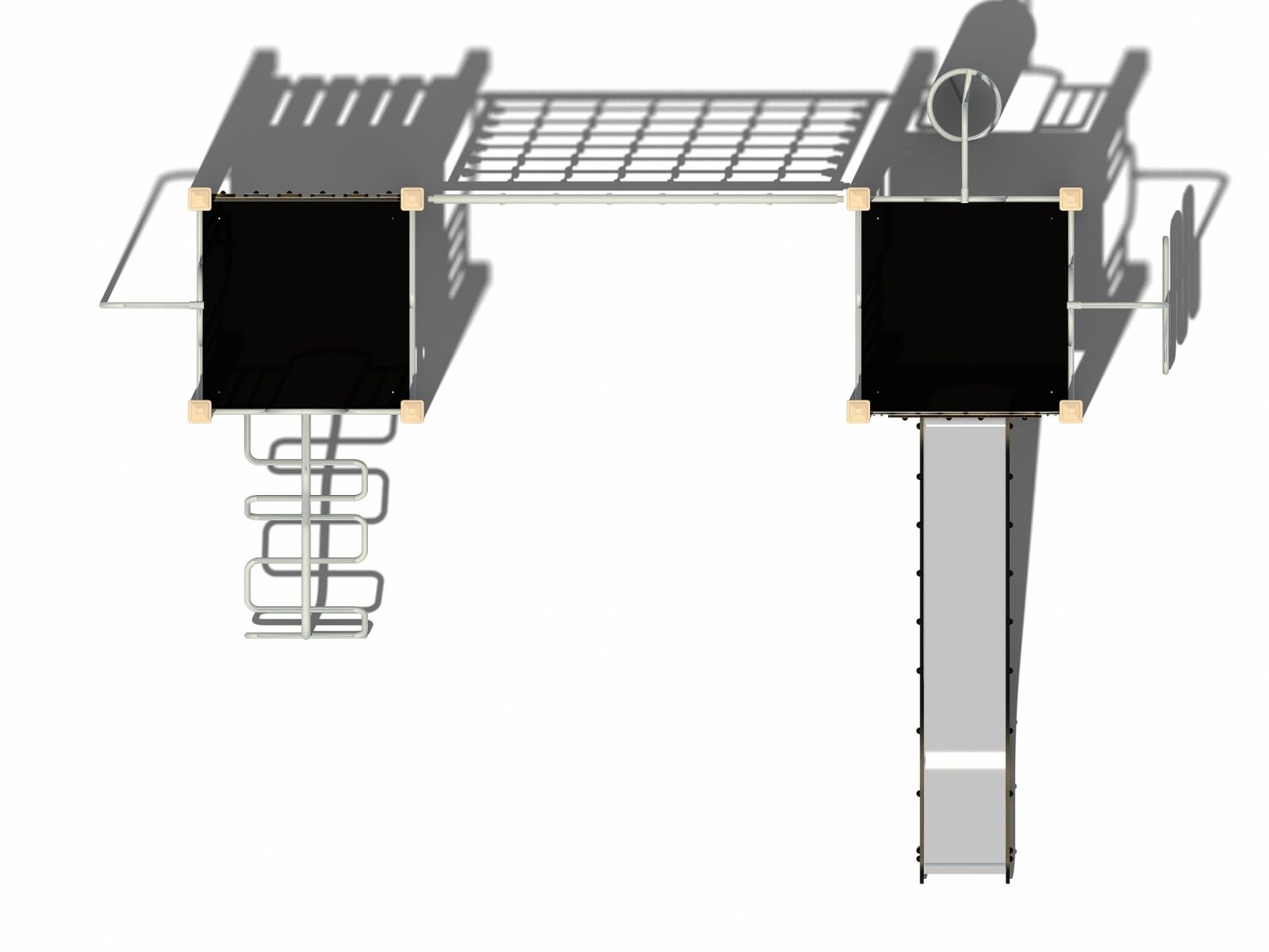 Het speeltoestel bestaat uit twee vierkante platformen die met elkaar verbonden zijn door een staand rvs klimrek met horizontale en verticale touwen. Dit klimrek zorgt op zich al voor een uitdaging om van het ene naar het andere platform te komen zonder dat je voeten de grond raken. Aan het platform met de rvs glijbaan kun je op verschillende manieren naar boven of beneden klimmen. Je vindt hier een slangentrap, een wikkelspiraal en aan de binnenzijde zijn stangen bevestigd die als trap dienen naar de vloer. Het ander platform is voorzien van een gebogen slangentrap en ook hier weer een klimrek met horizontale spijlen. Bovendien is aan deze vloer een glijstang gemaakt om als een brandweerman naar beneden te glijden.