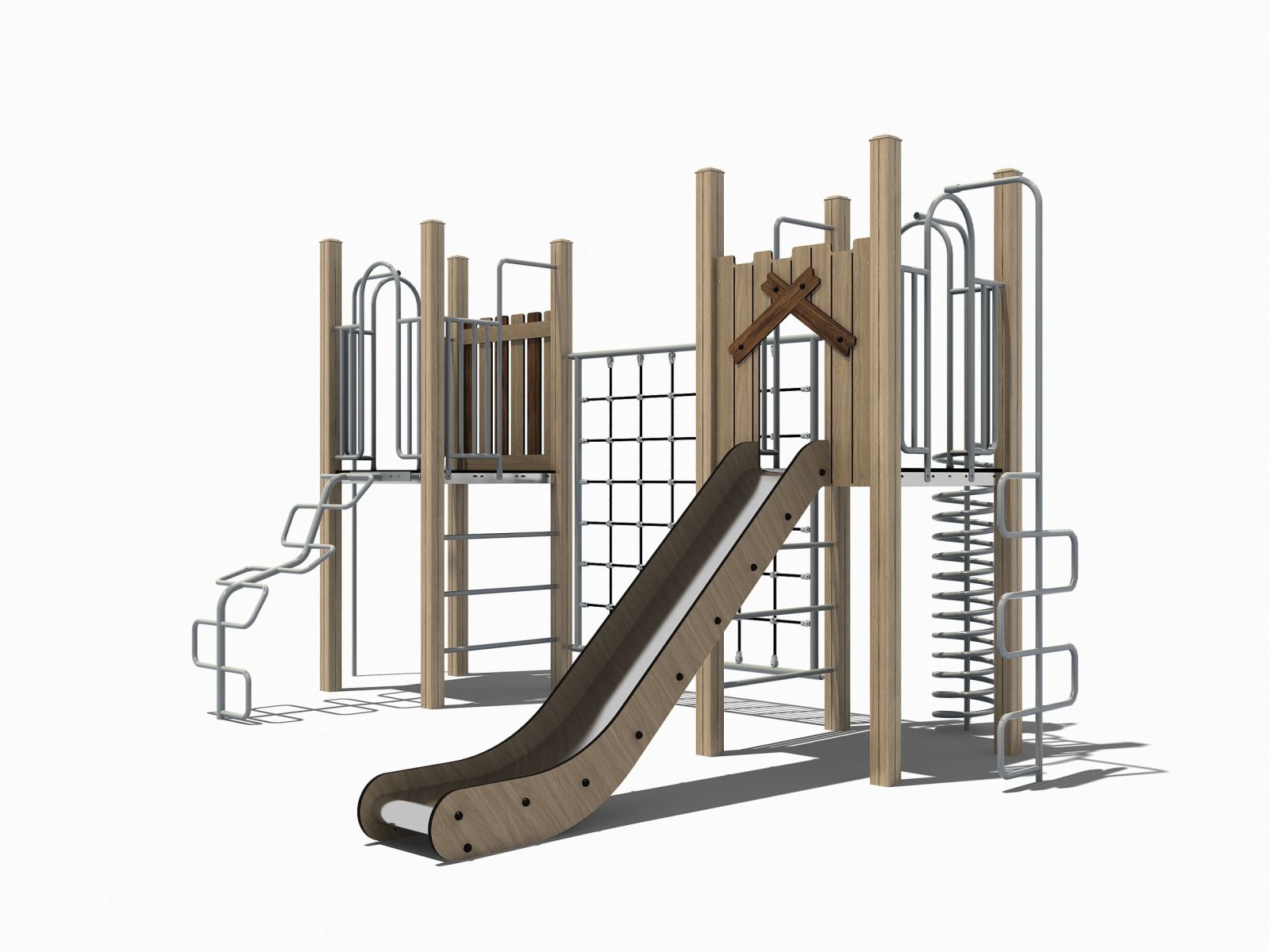 Dit combinatietoestel behoort tot de Nature line serie. In deze lijn hebben we aluminium staanders gebruikt die lijken op houten palen. Ook het plaatmateriaal van HPL heeft deze houtlook-uitstraling. Daarnaast zijn rvs speelelementen toegevoegd. De materialen van dit speeltoestel zijn bijzonder duurzaam en geschikt voor intensief gebruik. Dit professionele combinatietoestel voldoet daarmee aan alle Europese normen volgens EN-1176.