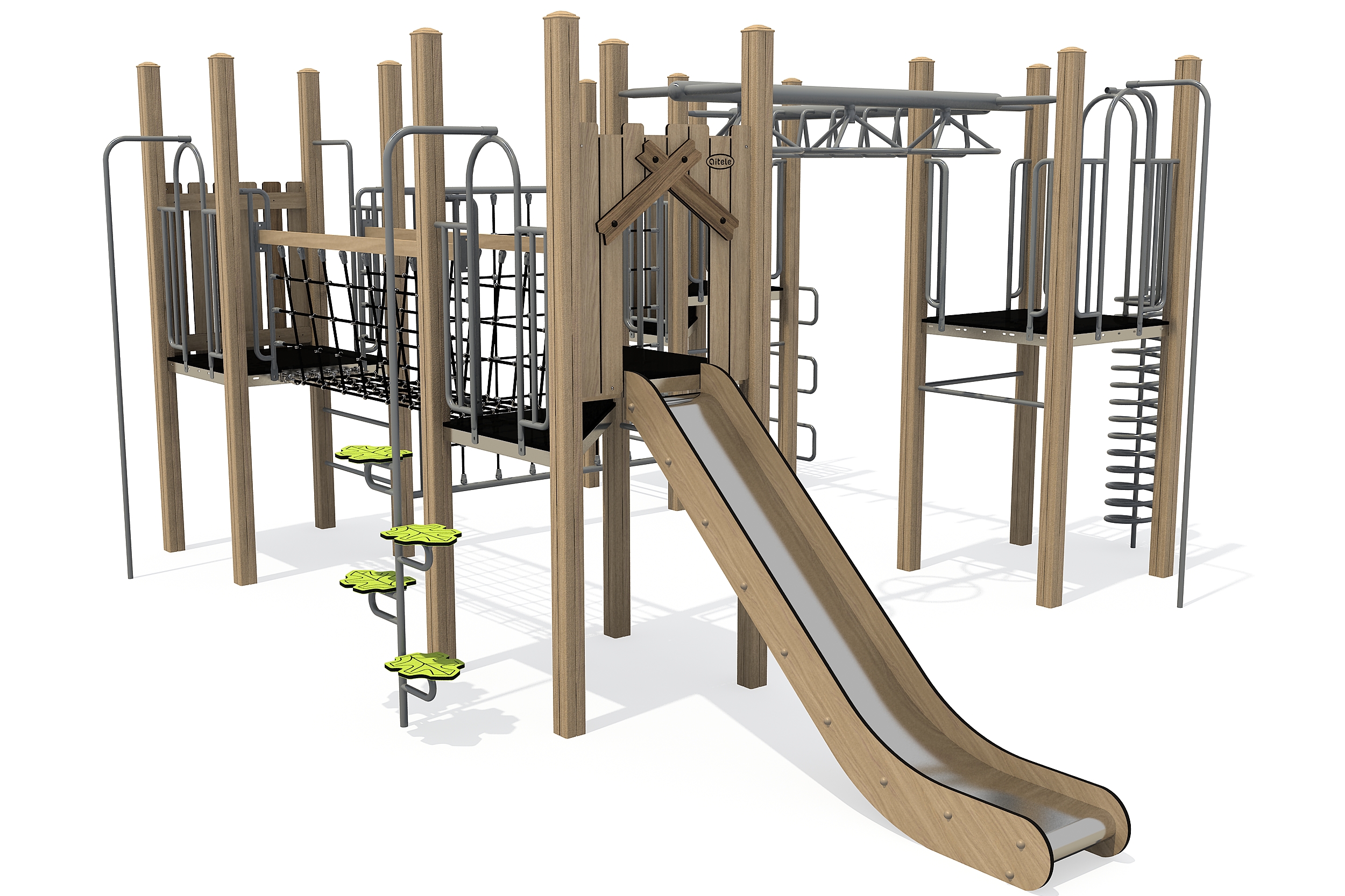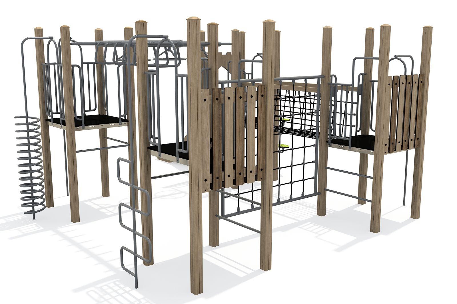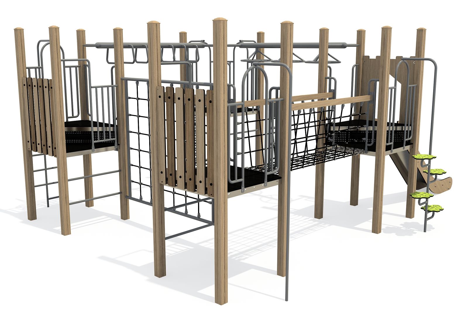 Dit speeltoestel bestaat uit vier platformen. Alle platformen zijn met elkaar verbonden door diverse speelelementen. Zo kun je al spelend van het ene naar het andere platform gaan. Ben je een beetje behendig en wil je je armspieren oefenen, kies dan voor de wielladder en ringladder. Ben je meer een klimgeit dan ga je via het verticale klimnet of je balanceert al wiebelend over de wiebelbrug.