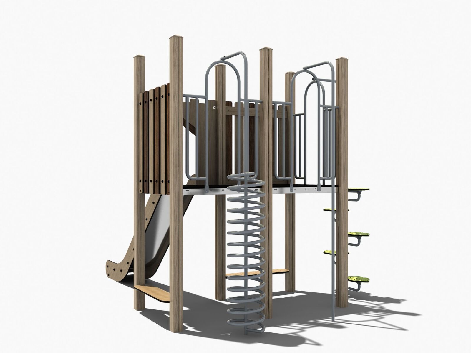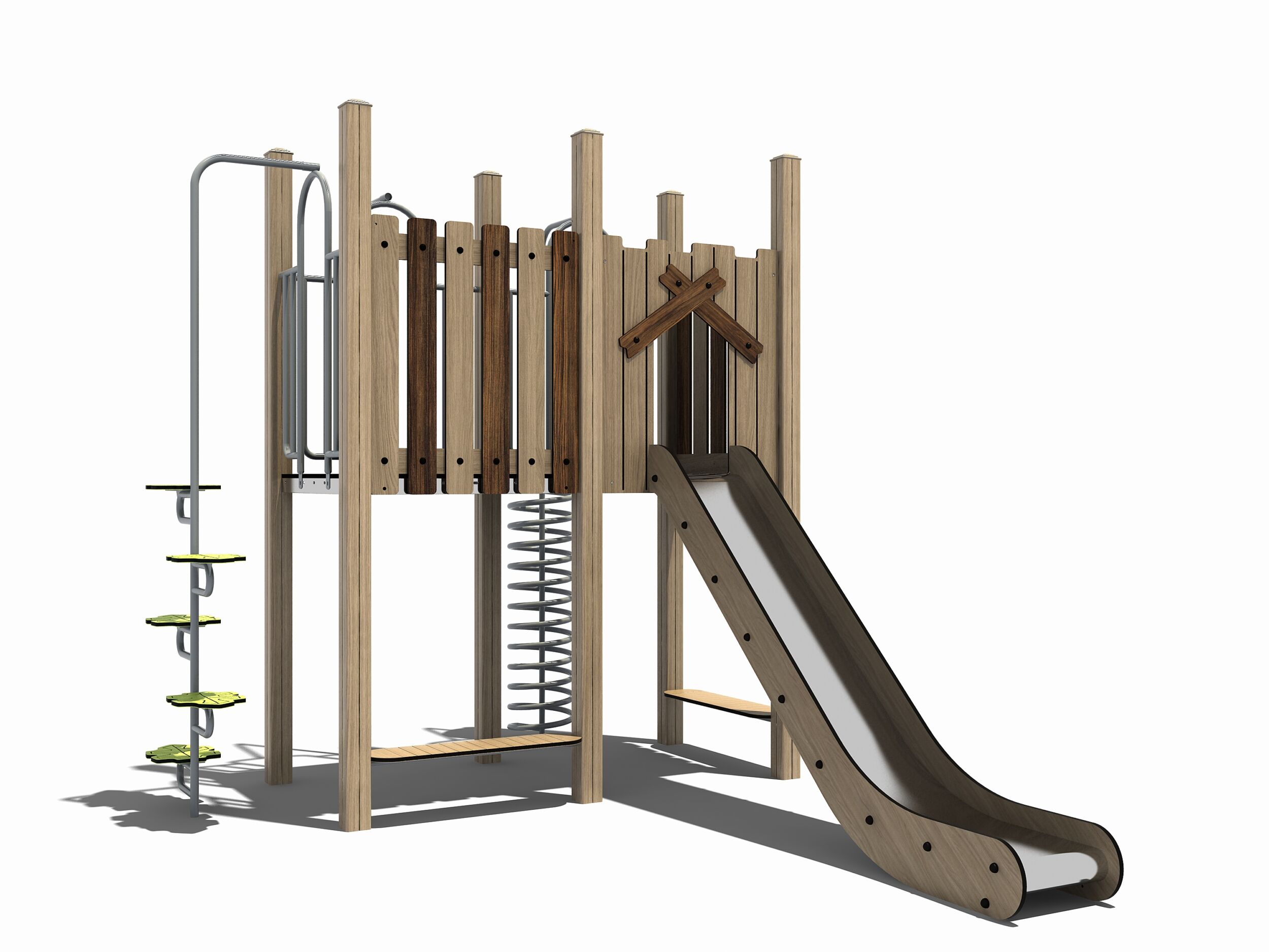 Dit combinatietoestel behoort tot de Nature line serie. In deze lijn hebben we aluminium staanders gebruikt die lijken op houten palen. Ook het plaatmateriaal van HPL heeft deze houtlook-uitstraling. Daarnaast zijn rvs speelelementen toegevoegd. De materialen van dit speeltoestel zijn bijzonder duurzaam en geschikt voor intensief gebruik. Dit professionele combinatietoestel voldoet daarmee aan alle Europese normen volgens EN-1176.