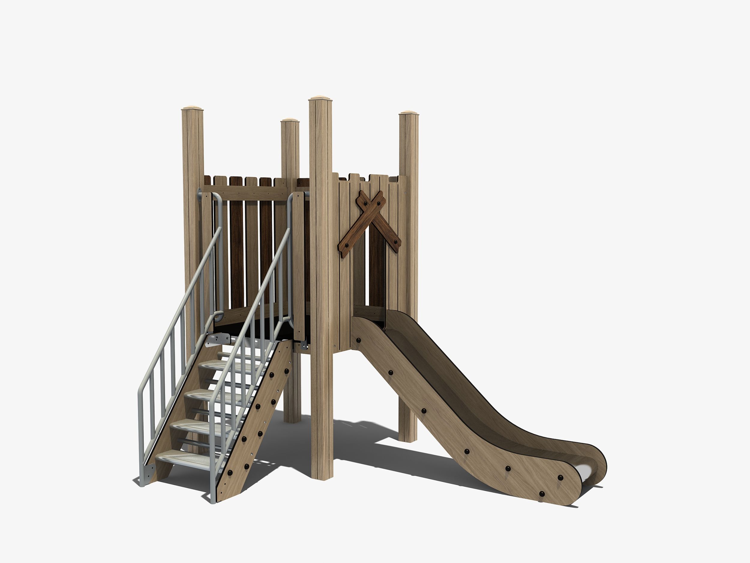 Deze glijbaan combineert de uitstraling van hout met het duurzame van metaal en kunststof. Alle onderdelen die niet van rvs zijn gemaakt, hebben de houtlook. Deze glijbaan heeft een robuuste trap naar boven met een rvs leuning waar je je goed aan vast kunt houden. Het lage platform van 90 cm is omringd door spijlwanden. De rvs glijbaan met opstaande rand zorgt voor een veilige gang naar beneden. Deze gecertificeerde glijbaan biedt ook de jongste kinderen de mogelijkheid met een veilig gevoel alleen naar boven te klimmen en naar beneden te glijden zonder begeleidende hulp.