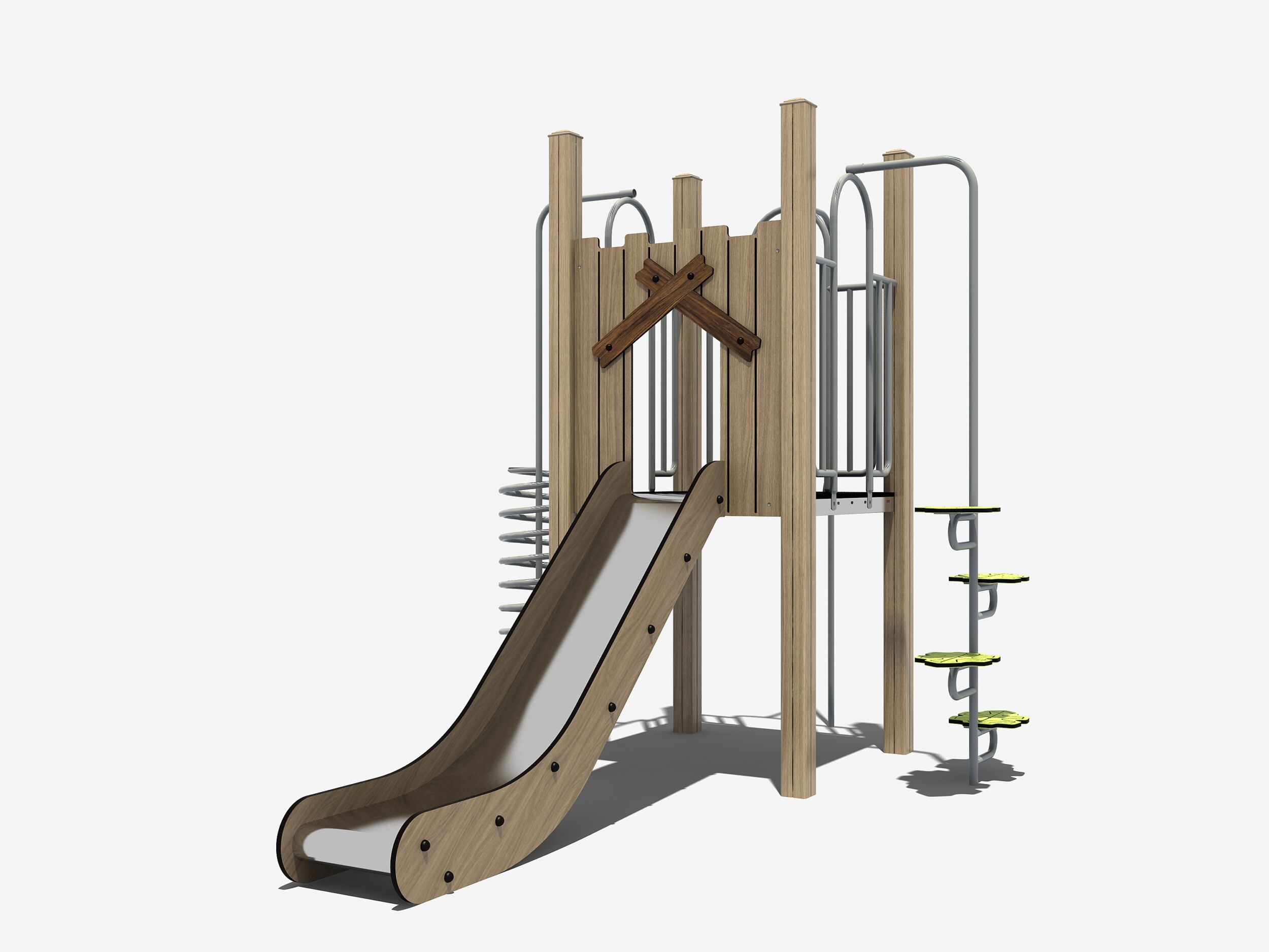 Met dit speeltoestel in de Nature line look hebben we de uitstraling van hout gecombineerd met rvs speelelementen en een roestvast stalen glijbaan. De aluminium staanders zijn in een houtlook, het plaatmateriaal is van hoogwaardig HPL en ook met een houtlook uitstraling. De gebruikte materialen zijn bijzonder duurzaam en geschikt voor intensief gebruik. Deze professionele glijbaan voldoet daarmee aan alle Europese normen volgens de EN-1176.