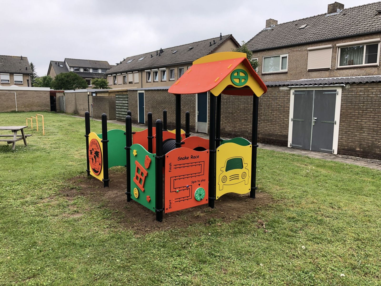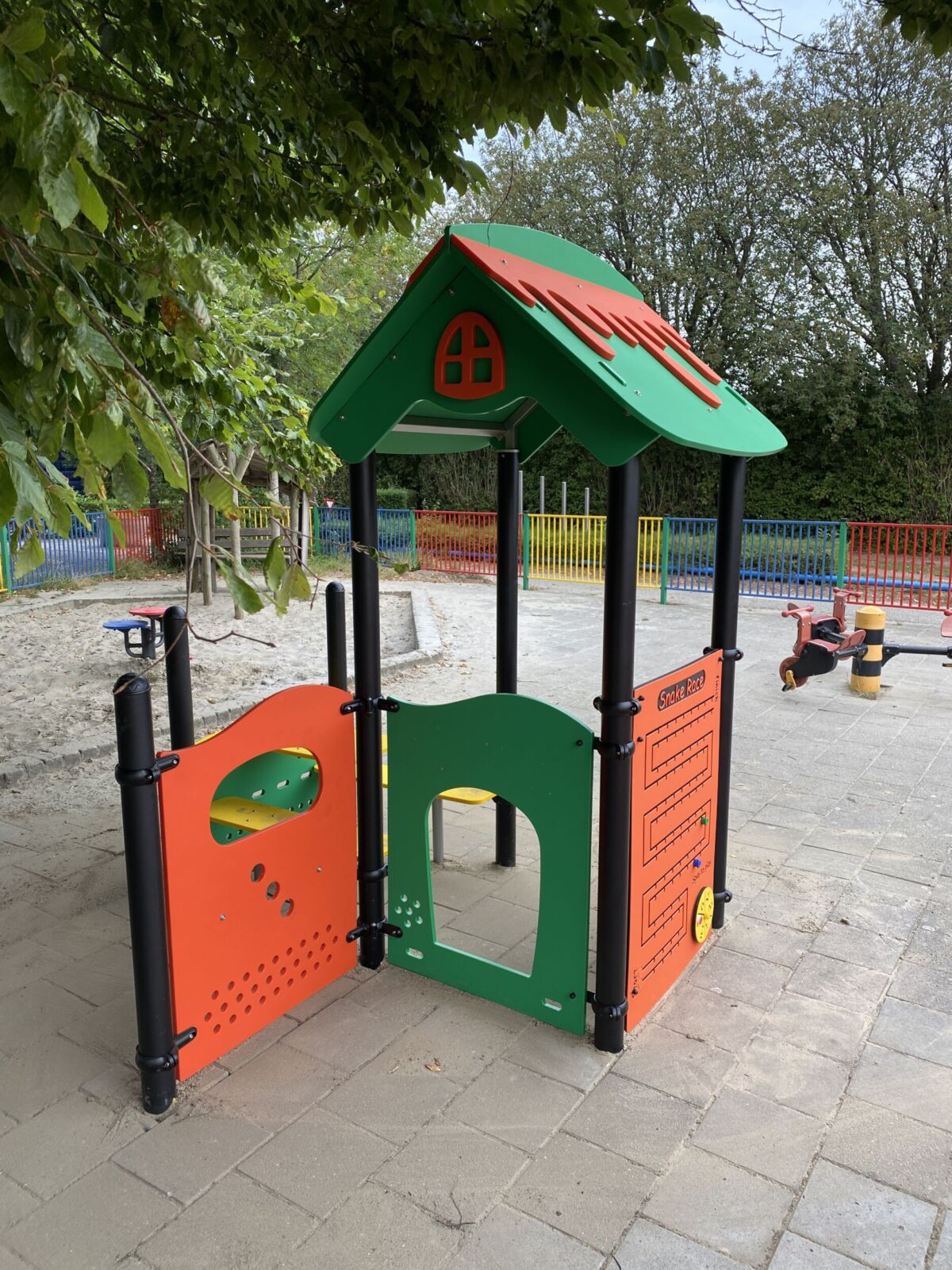 Kleurrijke speelhuisjes met leerzame spelpanelen