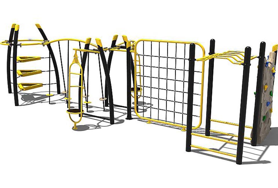 Het laatste speeltoestel zijn drie gebogen staanders met in het midden open driehoeken op verschillende hoogtes. De driehoeken zijn aan de palen bevestigd met versterkt staaltouw. Je kunt door het midden van de driehoeken naar boven maar ook via de buitenkant. Bovenaan zijn de staanders met elkaar verbonden door een ring. Deze geeft houvast maar hieraan kun je ook gaan hangen.