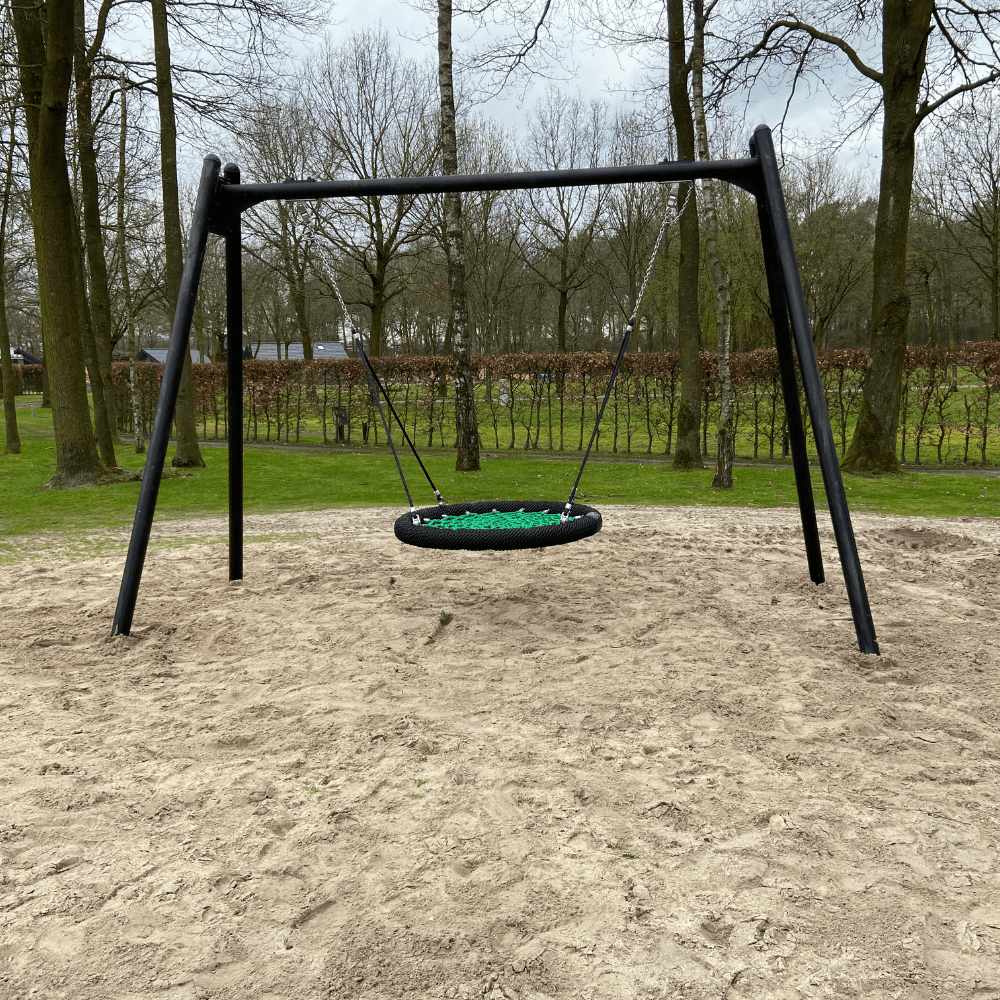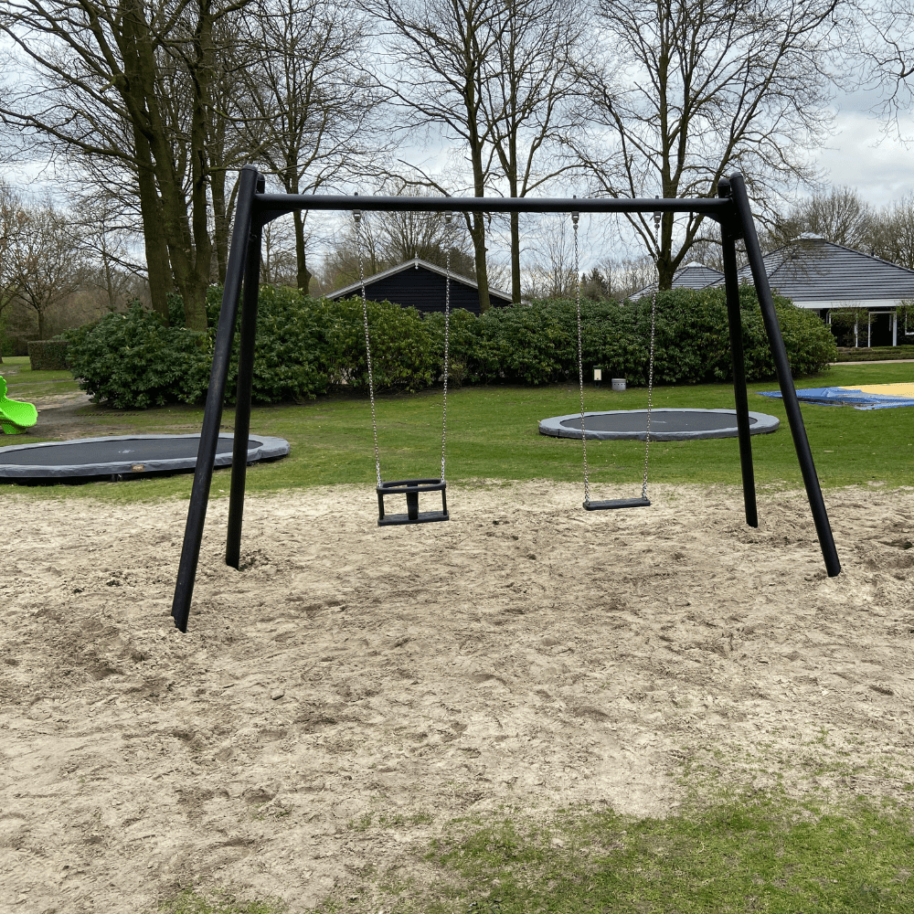 Naast dit nieuwe speeltoestel hebben we ook twee nieuwe schommels geplaatst. Aan het ene schommelframe is een babyschommelzitje in combinatie met een normale schommelzit gehangen. De andere schommel heeft een vogelnestmand. Met deze verschillende mogelijkheden is er qua schommelen aan iedere leeftijd gedacht. Met het speeltoestel, de schommels en ook nog twee trampolines is deze nieuwe speelplek helemaal compleet. Laat de gasten maar komen!