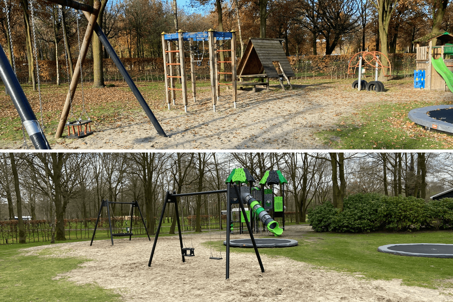 Het nieuwe grote speeltoestel is in de plaats gekomen voor een aantal oude speeltoestellen die aan vervanging toe waren. Voor de duidelijkheid laten we op de laatste foto bij dit project de situatie van voor en na de tijd zien.