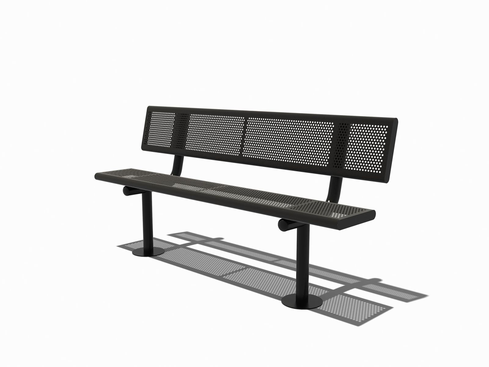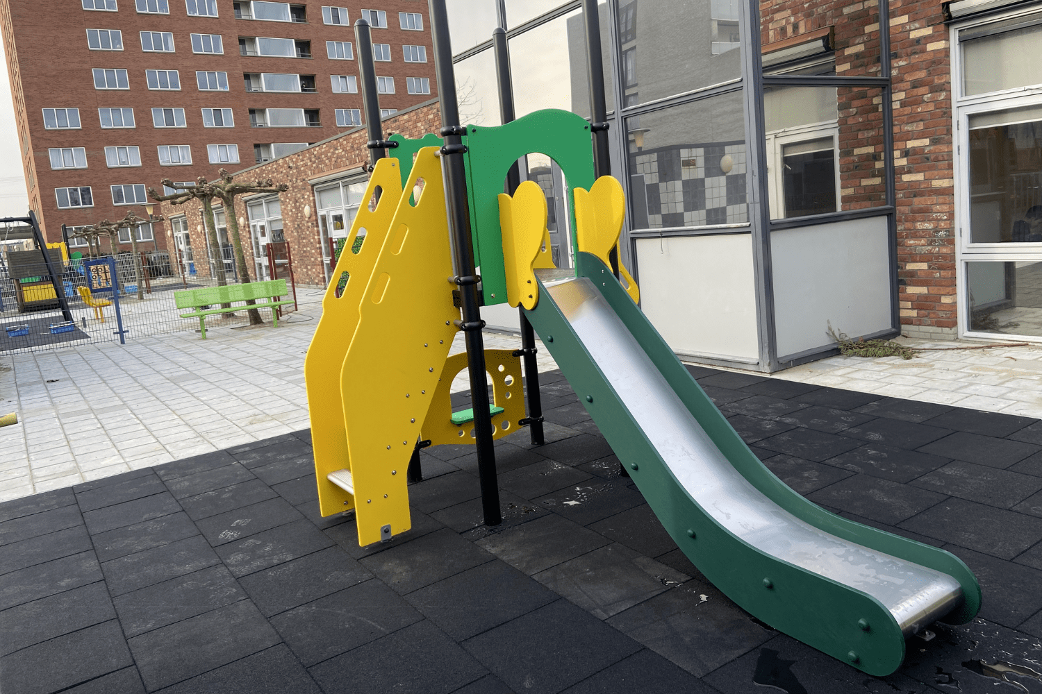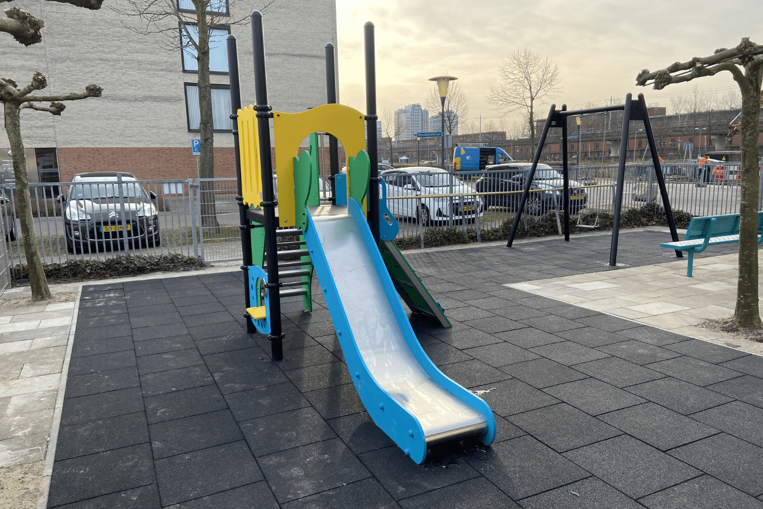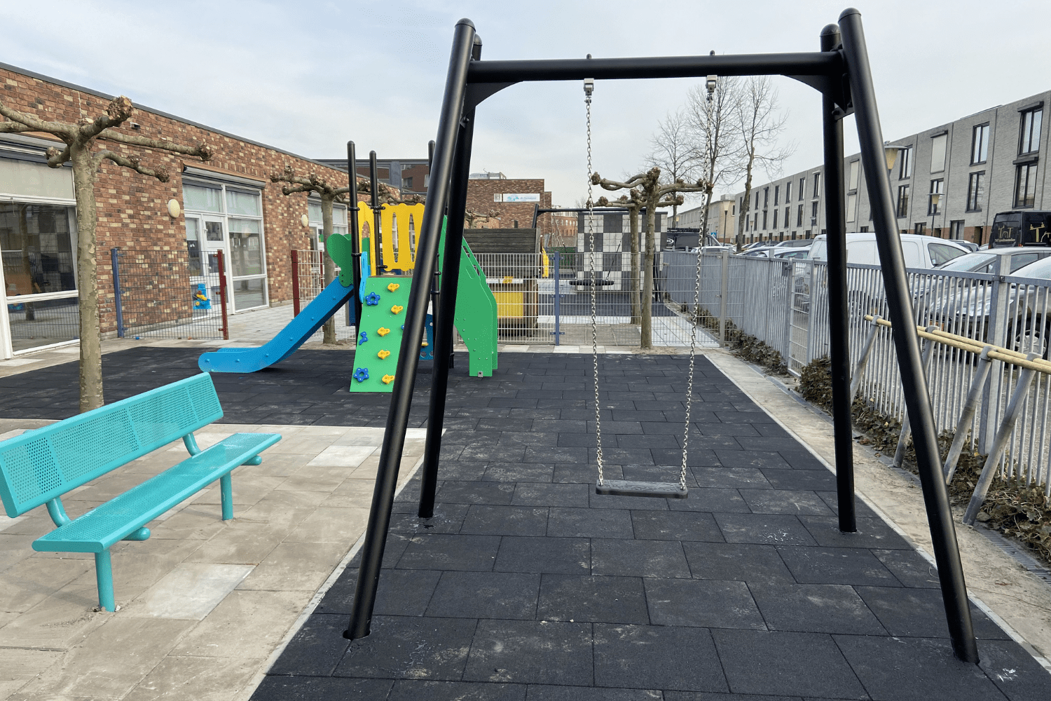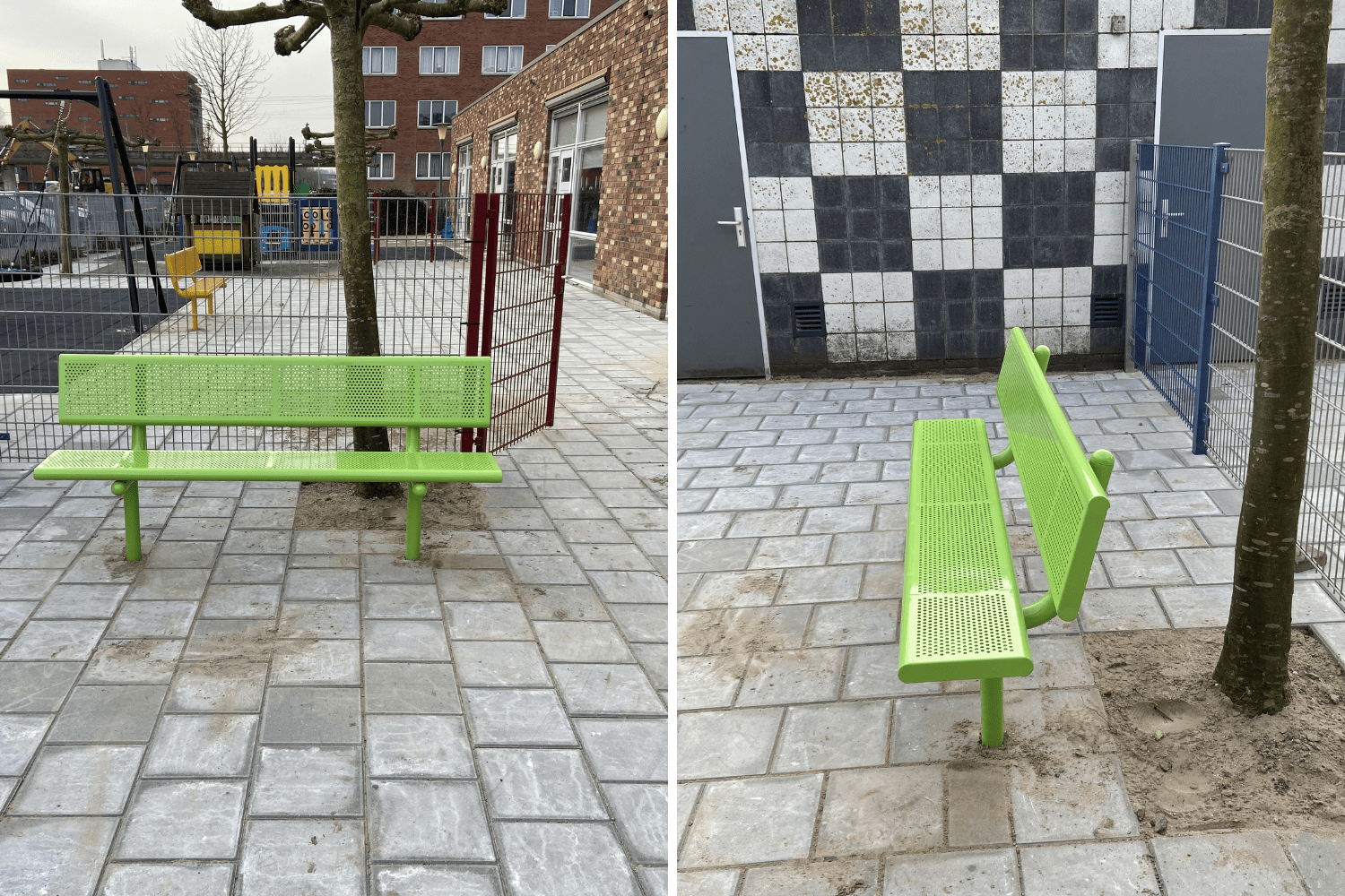 Naast de speeltoestellen mochten we nog 3 metalen zitbanken met rugleuning aan de speelplekken toevoegen. Ook hier is weer gekozen voor frisse kleuren. En het is natuurlijk geen toeval dat dit de kleuren zijn die ook voor de PE-delen van de speeltorens zijn gebruikt.