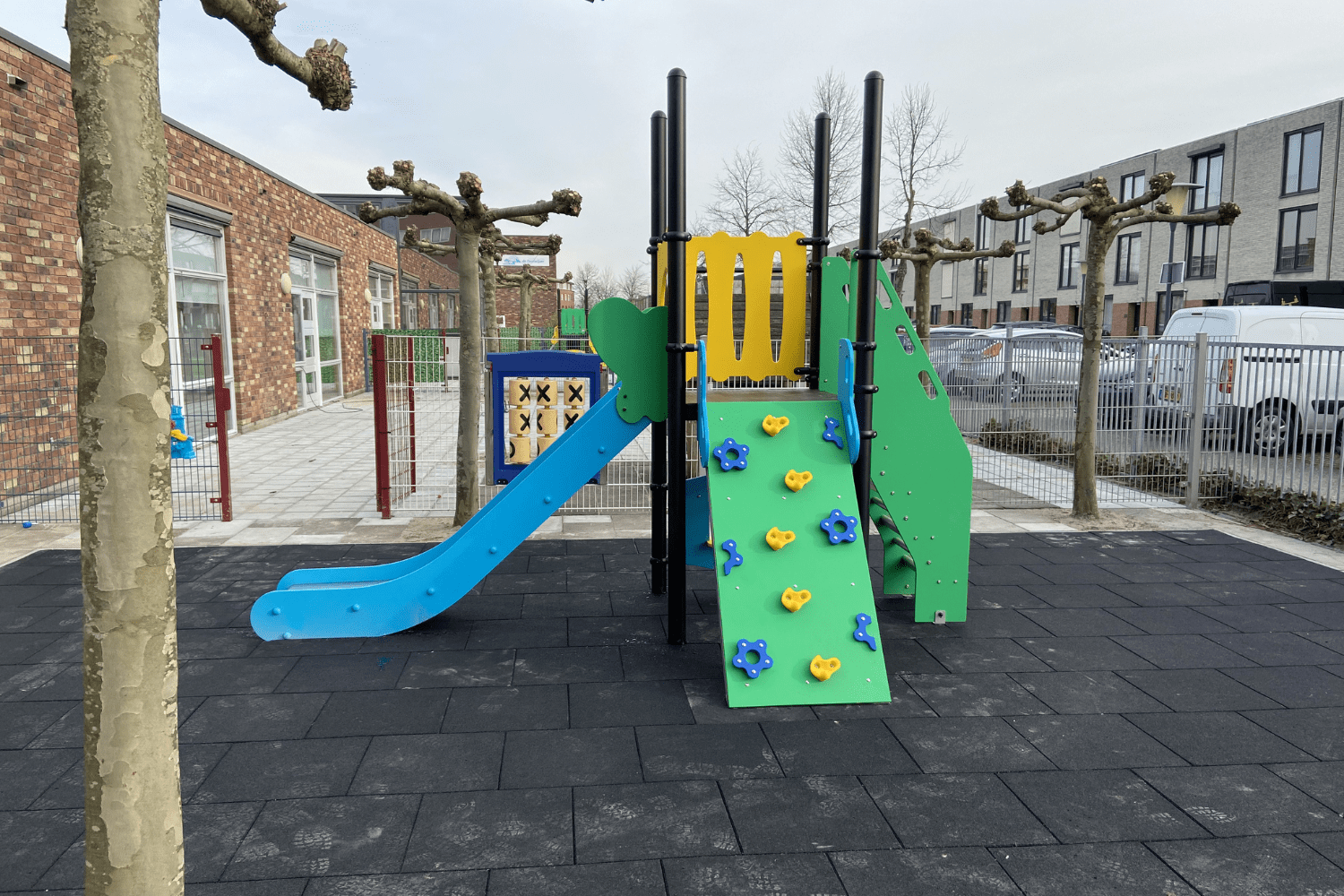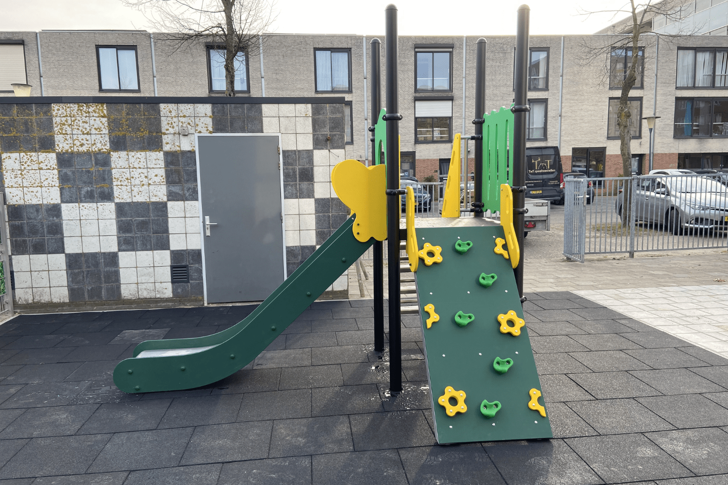 Onder alle speeltoestellen zijn zwarte rubber tegels gelegd. En dat was bij elkaar een hele oppervlakte. Deze veiligheidstegels vormen een veilige valdempende ondergrond onder de speeltoestellen. Ze hebben absorberende eigenschappen en vangen schokken op bij een val. Maar naast veiligheid maak je met rubber tegels ook een strakke speelplek. Ze moeten af en toe wel schoongespoten worden maar zijn voor de rest vrijwel onderhoudsvrij. Bovendien gaan ze jarenlang mee. Een goede keuze van de Bolsterberg dus.