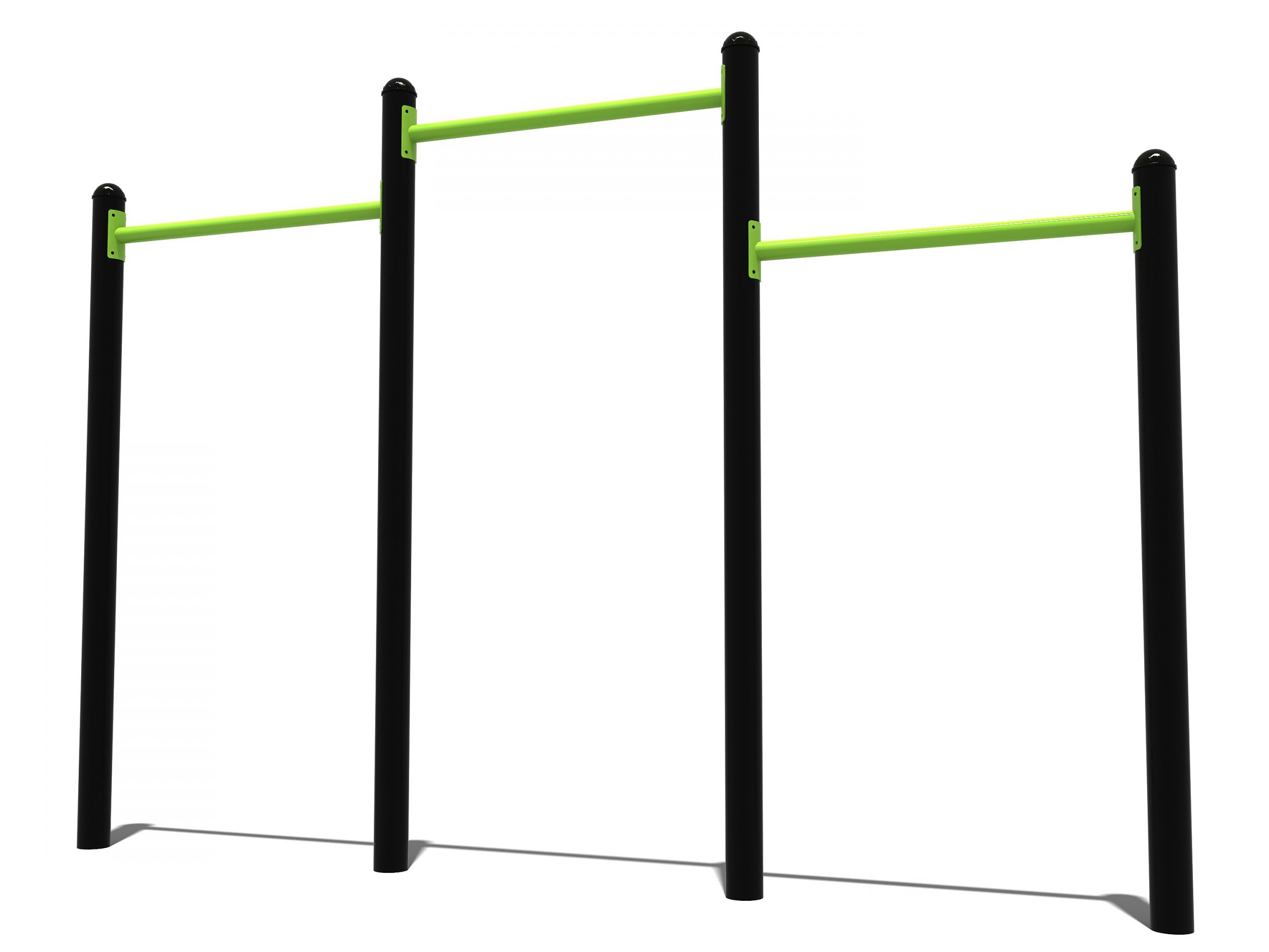 De driedelig rekstok bestaat uit drie horizontale stangen die op verschillende hoogteniveaus zijn gemonteerd tussen verticale palen. Dit sporttoestel voor buiten is geschikt voor vele oefeningen waaronder pull-ups, chin-ups en muscle-ups.
