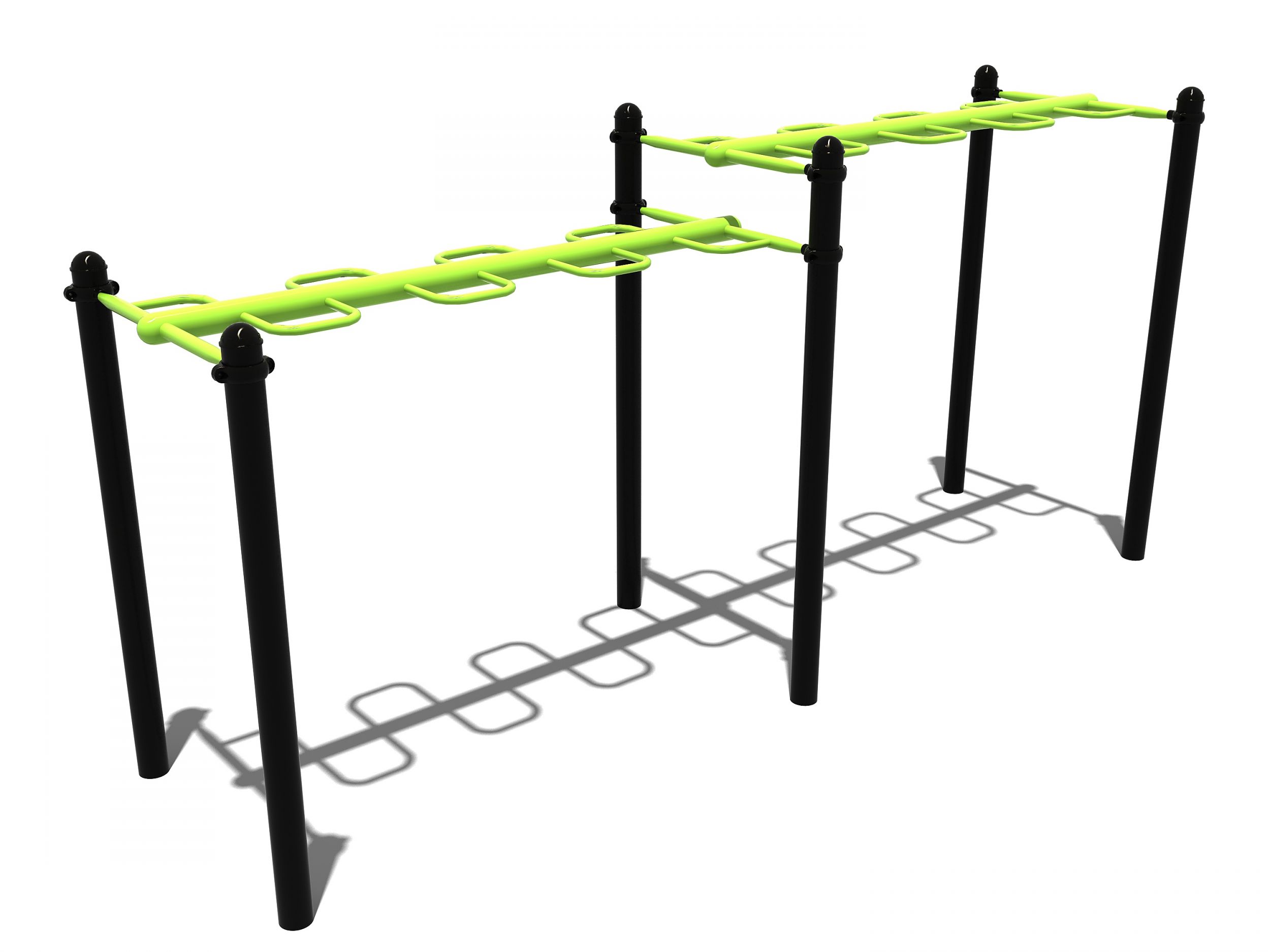 De dubbele monkey bar met snake ladder is een outdoor fitnesstoestel dat vaak wordt gebruikt tijdens calisthenicstrainingen of obstacle races. Maar wij verwerken deze ook in onze speeltoestellen voor de openbare ruimte. De dubbele monkey bar bestaat uit zes staanders waartussen twee snake ladders zijn gemonteerd op twee verschillende hoogteniveaus. De snake ladder heeft een golf- of zigzagvorm die zorgt voor extra uitdaging bij grip. De gebogen vorm dwingt om verschillende griptechnieken te gebruiken.