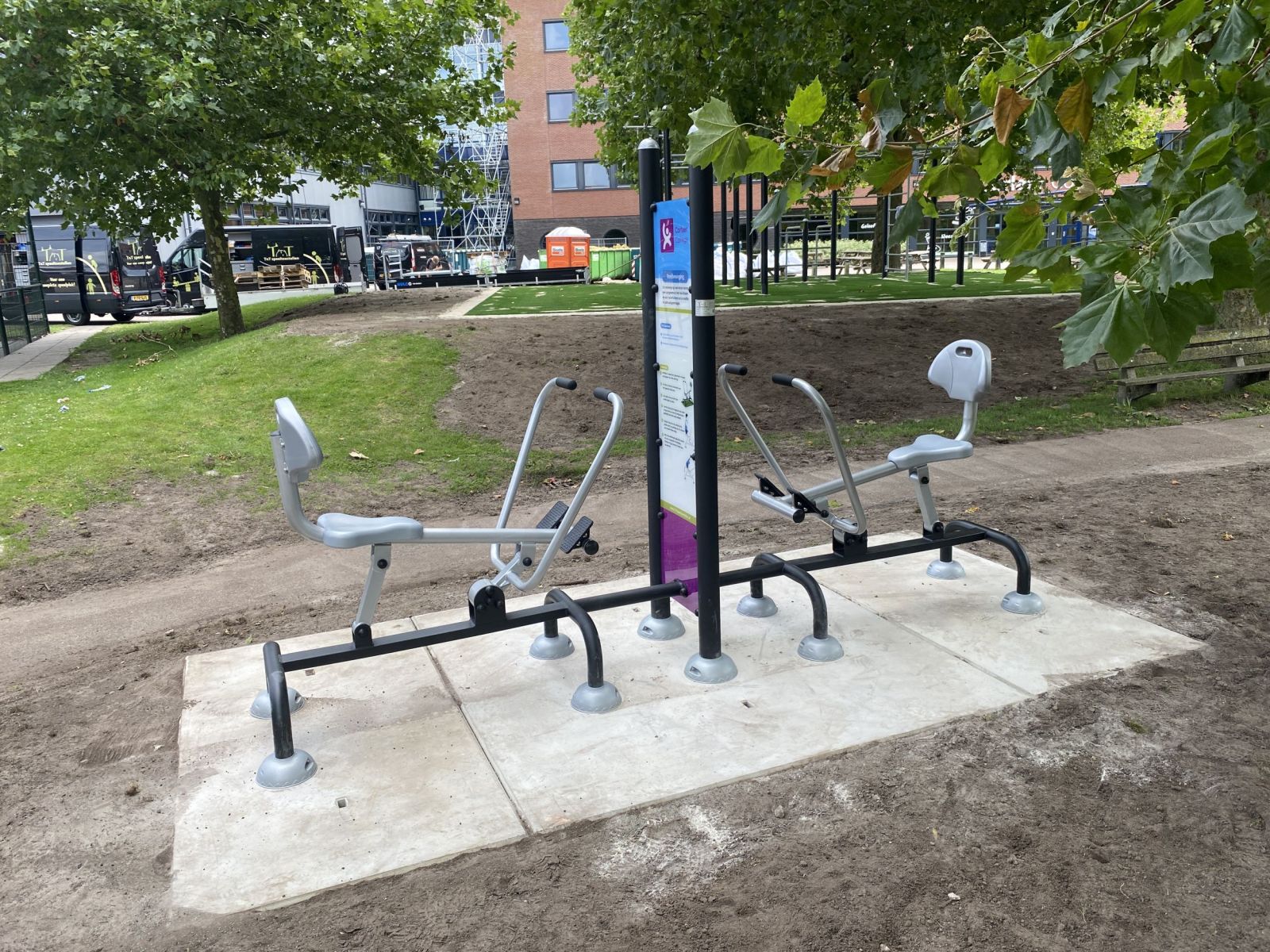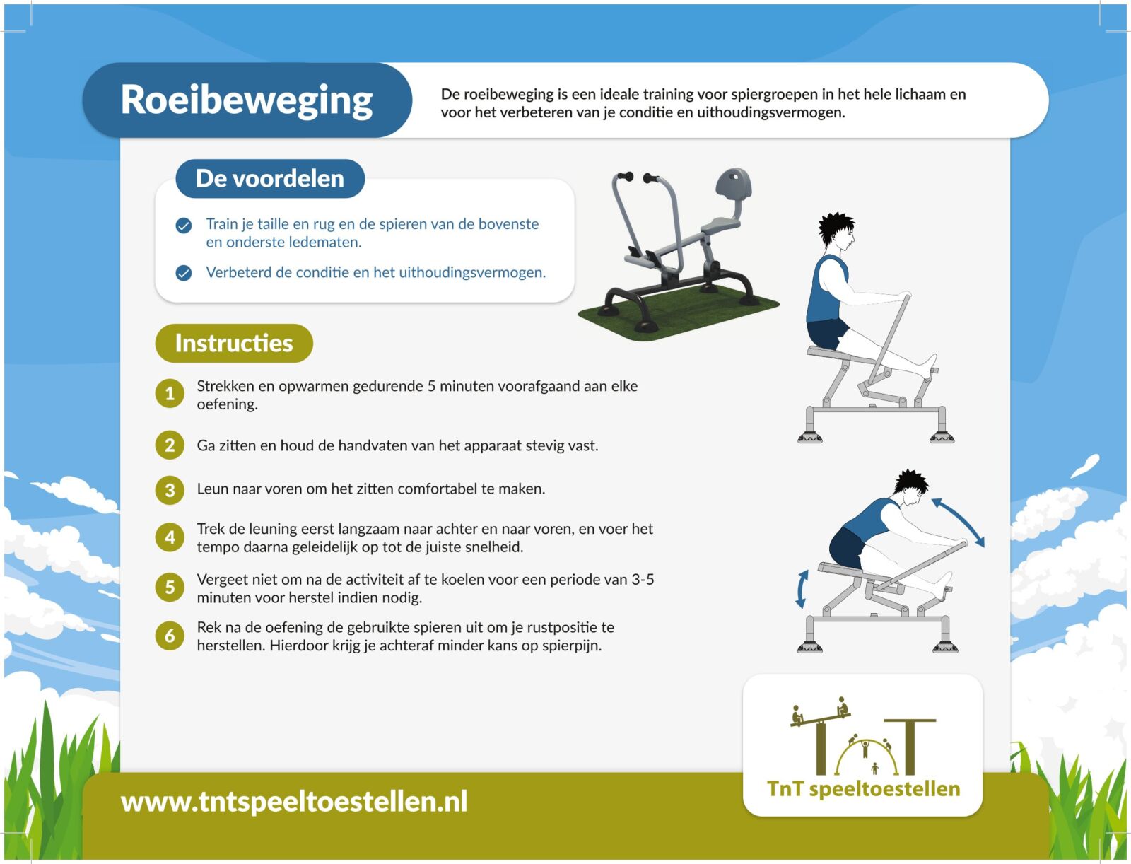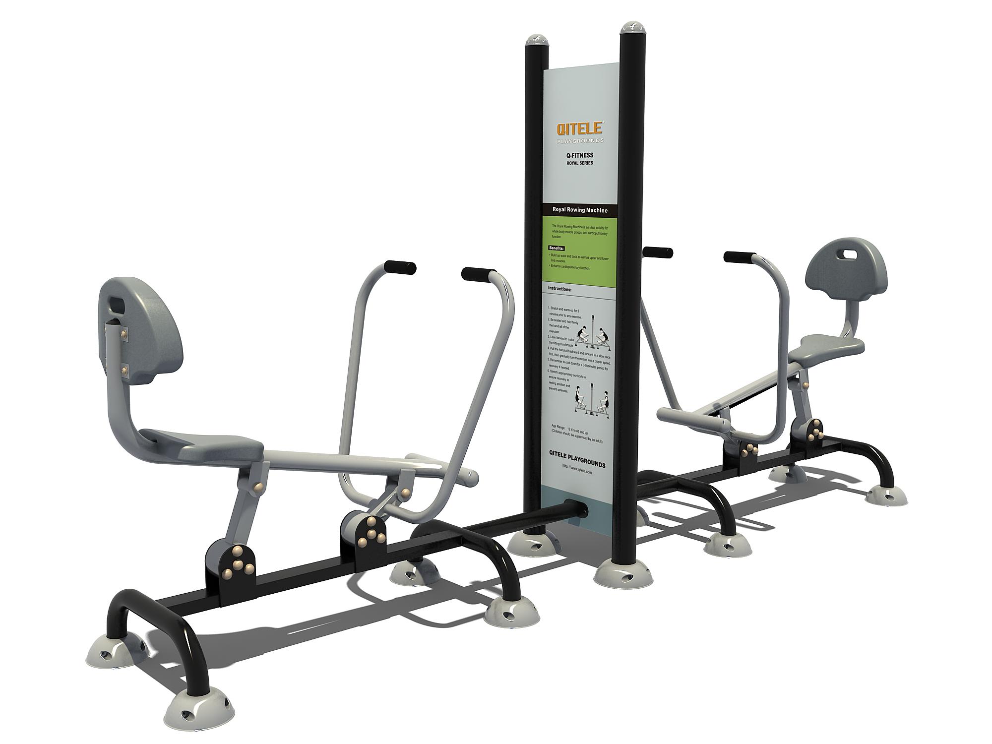 De Dubbele Roeitrainer is een compleet outdoor fitnesstoestel bestaande uit twee workout trainingsstations met een geïntegreerd instructiebord waarop informatie over de oefeningen.