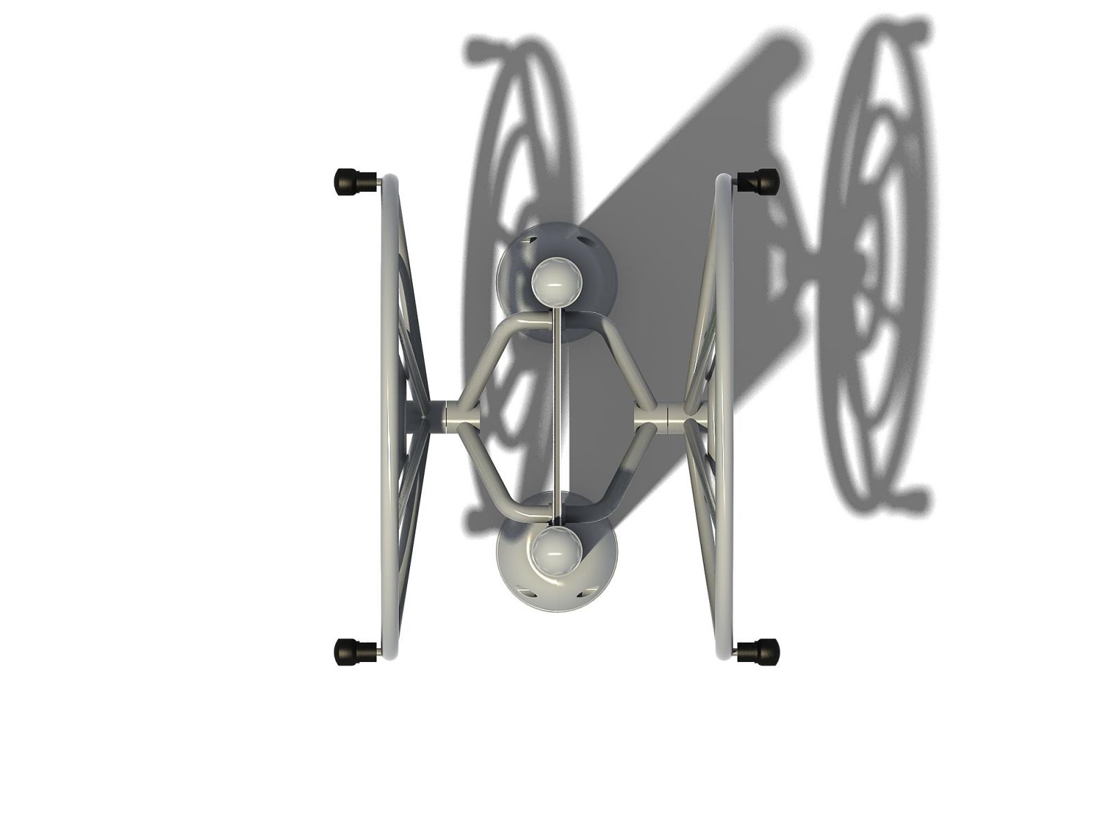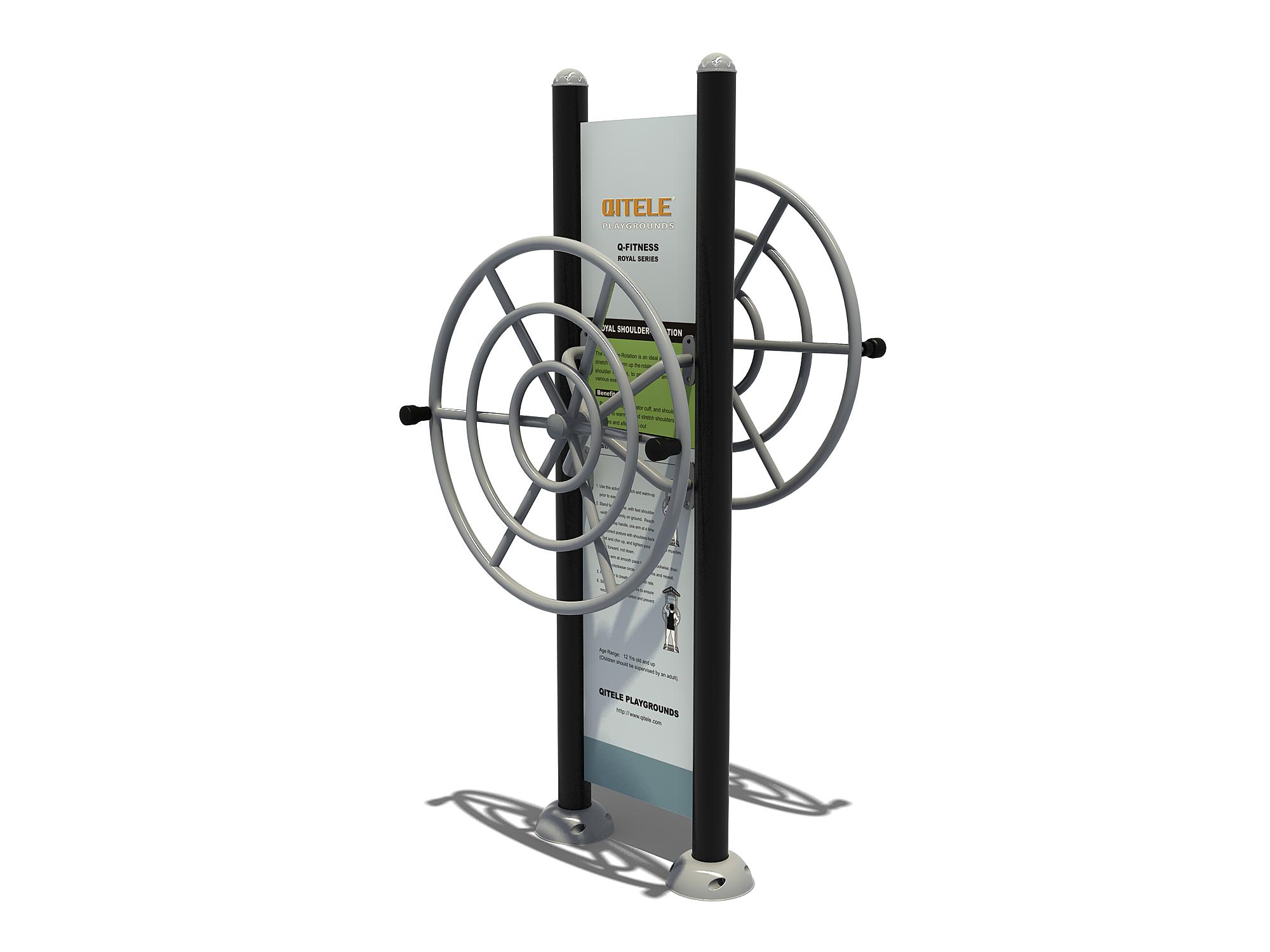 Dit Flex Wheel is een compleet outdoor fitnesstoestel bestaande uit twee workout trainingsstations met een geïntegreerd instructiebord waarop informatie over de oefeningen.