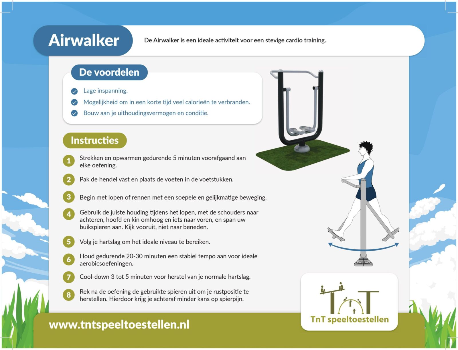 De Airwalker bootst de loopbeweging na. Plaats de handen op de bovensteun en zet de voeten op de voetsteunen. Zet Airwalker in beweging door een langzame loopbeweging en versnel naar eigen goeddunken naar rennen. Let vooral op je houding tijdens het lopen, houd je schouders naar achteren en je hoofd en kin omhoog. Blijf naar voren kijken en niet naar beneden. De Airwalker is een cardio fitnesstoestel dat het uithoudingsvermogen verbetert en waarmee je in in vrij korte tijd veel calorieën verbrandt. Je traint met de Airwalker de spieren in de buik, heup en onderrug. Deze training is ook goed voor de quadriceps en hamstrings.