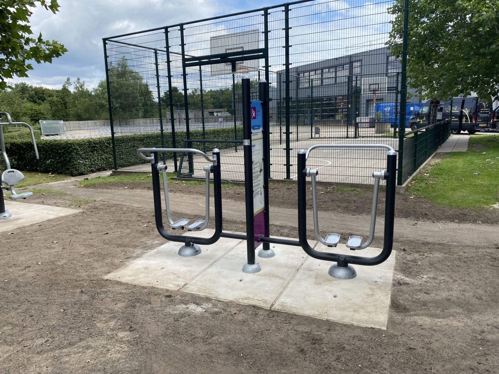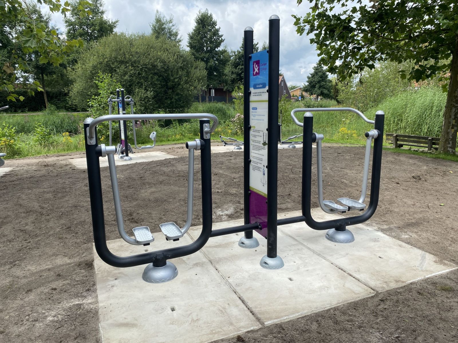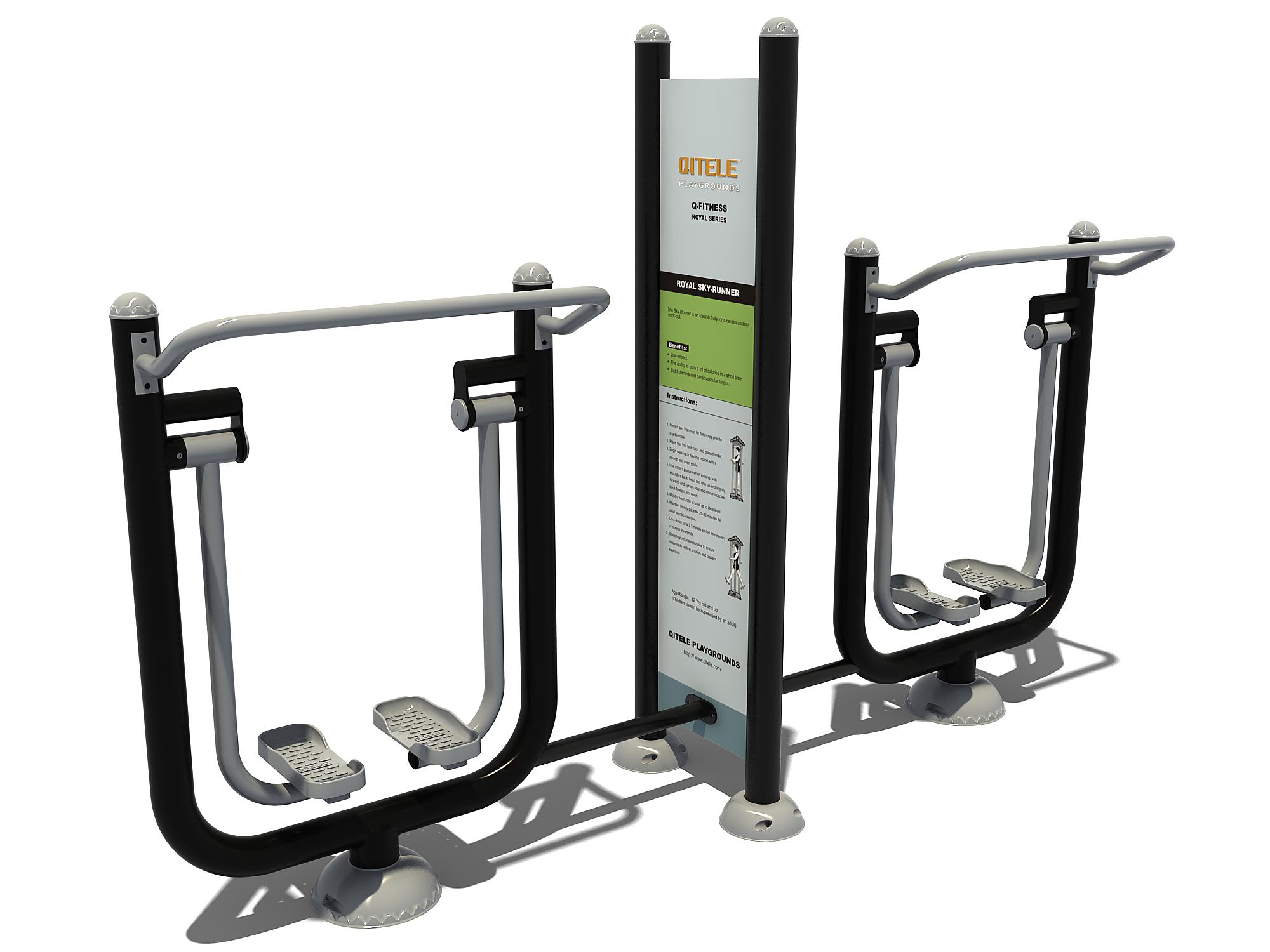 De Dubbele Airwalker is een compleet outdoor fitnesstoestel bestaande uit twee workout trainingsstations met een geïntegreerd instructiebord waarop informatie over de oefeningen.