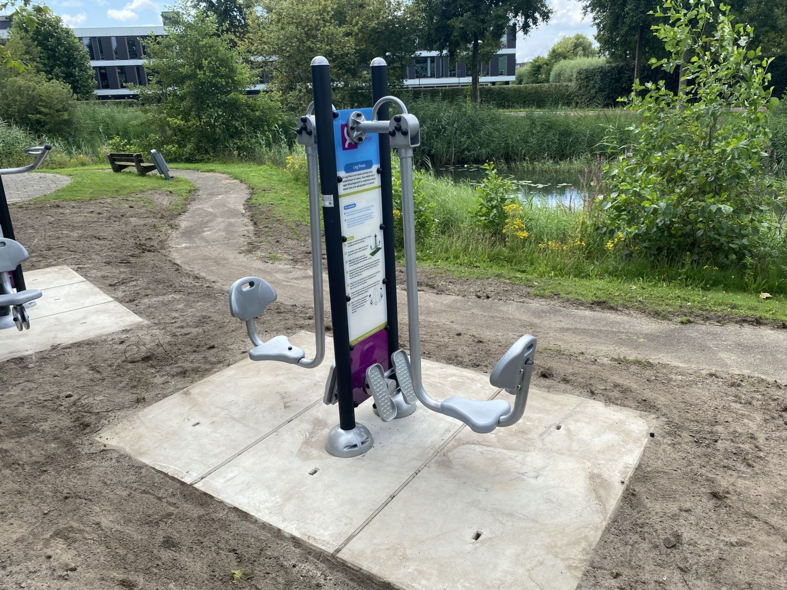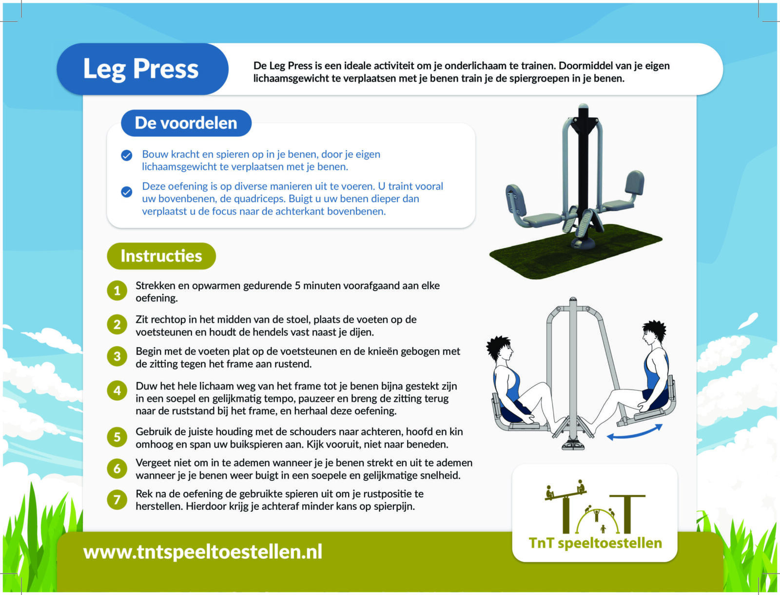De Leg press is een outdoor fitnesstoestel dat niet alleen de bovenbeenspieren traint maar ook de hamstrings (deze houden de knieën stabiel), de bilspieren (zodat je de heupen kunt strekken bij het wegduwen) en de kuiten en enkels. Op het bijbehorende instructiebord vind je alle informatie over de uit te voeren training als ook extra oefeningen die je op het fitnesstoestel kunt doen. De Leg Press is in verschillende kleuren en kleurstellingen leverbaar. Vraag ons naar de mogelijkheden.